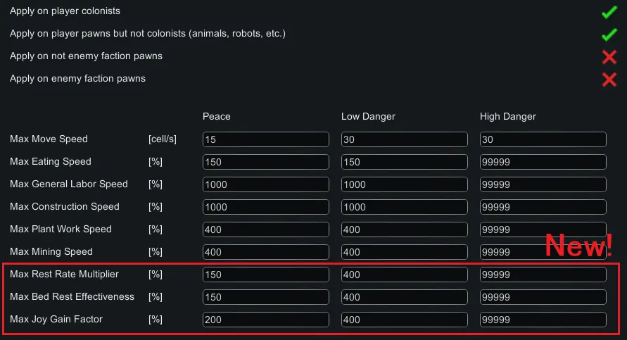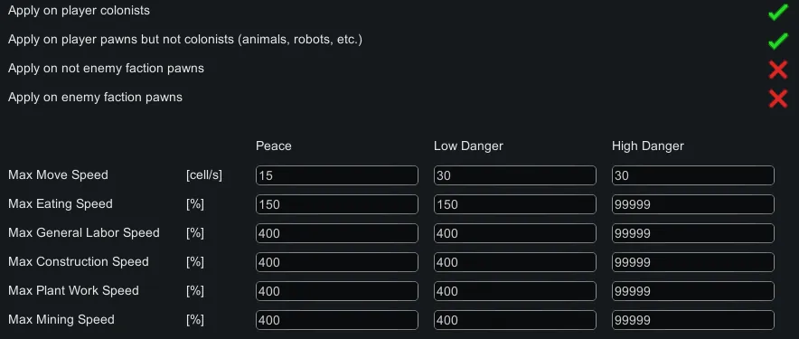 This mod limits the speed of moving, eating, general labor, construction, plant work, and mining according to each danger level. This will allow reinforced pawns to take it easy when it's peaceful, while automatically getting their full strength when enemies come.