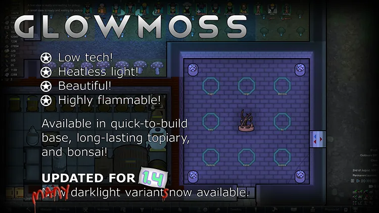 Light up your RimWorld with bioluminescent mycorrhiza! This bright, heatless light source is fantastic for low technology starts, but you can also grow it in pots to beautify your shrines and your throne rooms. ...Too bad it's also really, really flammable.