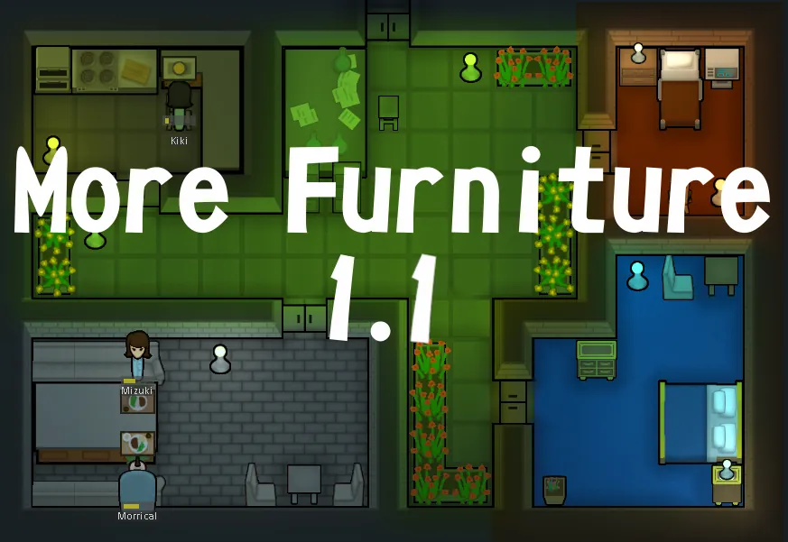 More Furniture is a small mod that adds about a dozen new items into Rimworld. It was created so you'd have more variety when choosing things to fill your colonist's rooms with. Originally created by Anonemous2, development continued by me.