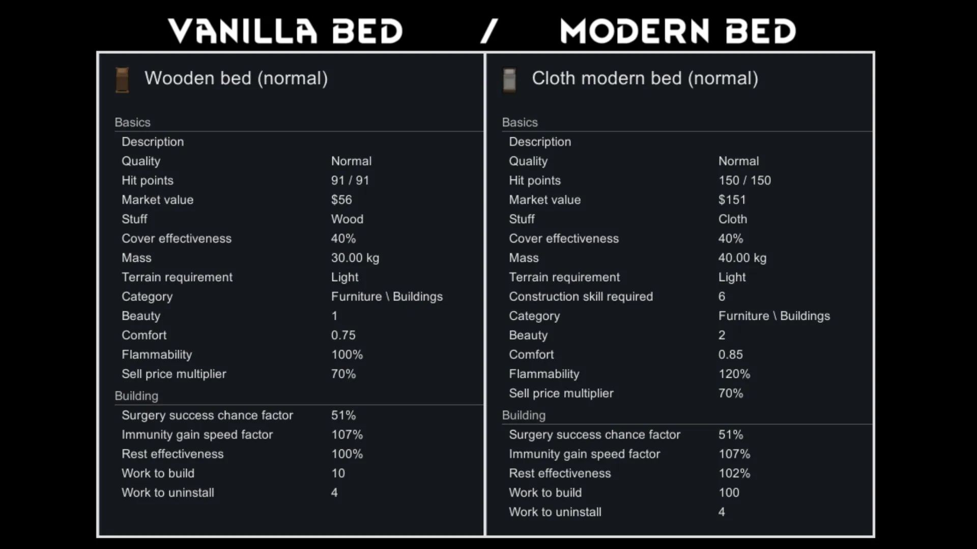 Modern bed is slightly more comfortable and resting effectiveness than a vanilla bed. It is also accepted to royalty pawns. (referent to the screenshot for stats.)