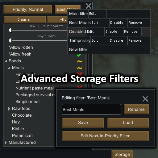 Adds the ability to add extra advanced and configurable filters to storage areas. It also allows filters to be saved and loaded between multiple saves.