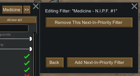 Say you have prisoners in a room with a storage container set to haul simple meals. What happens when you run out of simple meals, your prisoners starve? Well not anymore, because with these prioritizing filters you can have it stock fine meals in the case that the simple meals run out, and when the fine meals run out have it stock lavish meals, etc. etc.