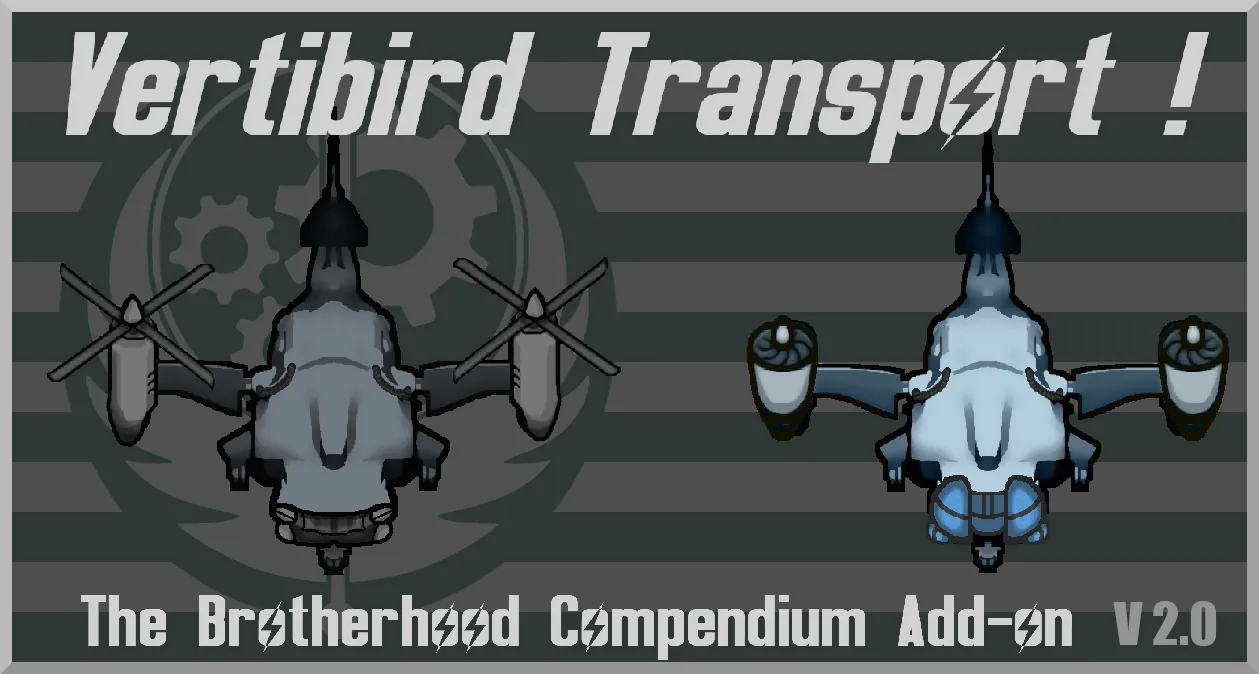 This mod works as an add-on for the [url=https://steamcommunity.com/sharedfiles/filedetails/?id=1547669587]Brotherhood Compendium[/url], and allows constructions of the XVB-02 Vertibird and the XVH-01 Vertihawk (see ingame description for more details and pseudo lore) !