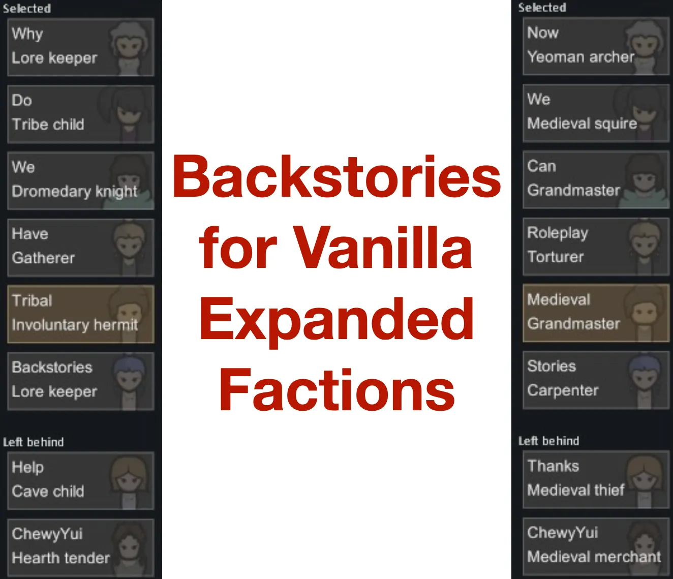 Many, if not most, wont be aware that Vanilla Factions Expanded Medieval actually has some custom medieval backstories, which sadly no-one will see, due to them requiring a "no-longer available on Steam, and broken if you get it on GitHub" mod called [RF] Editable Backstories and Names 1.1 to be active, for the patches to apply and the backstories available. Finding and activating the mod gives you wacky adult backstories, such as game developer and intergalactic pilot (hence the broken part). Additionally, there's several fitting backstories already in Rimworld that would be great for the Medieval Faction features, but go unused due to how the mod was coded (for justifiable reasons)