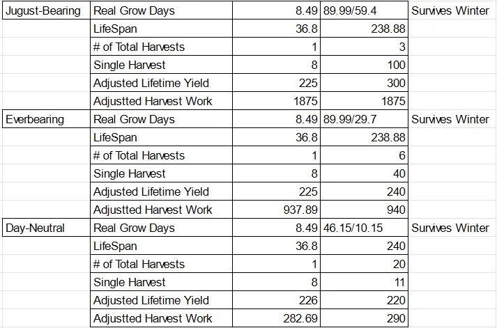 [*] Strawberries have been split into 3 varieties; Everbearing, Jugust-Bearing, and Day-Neutral. See spreadsheet for details.