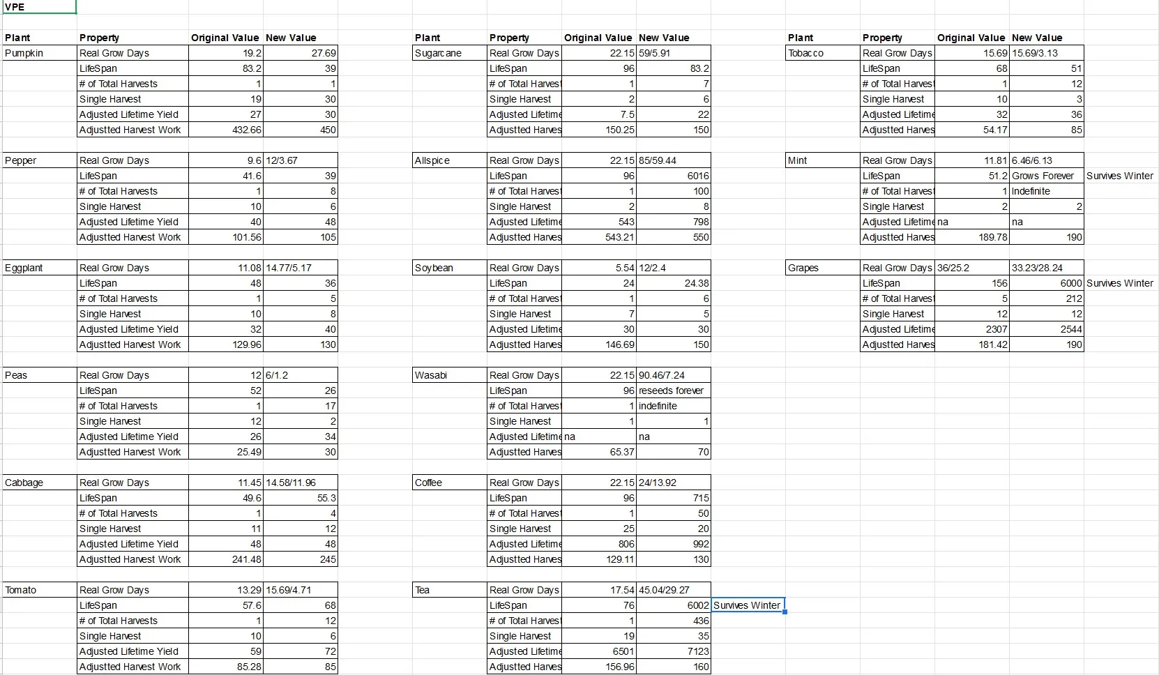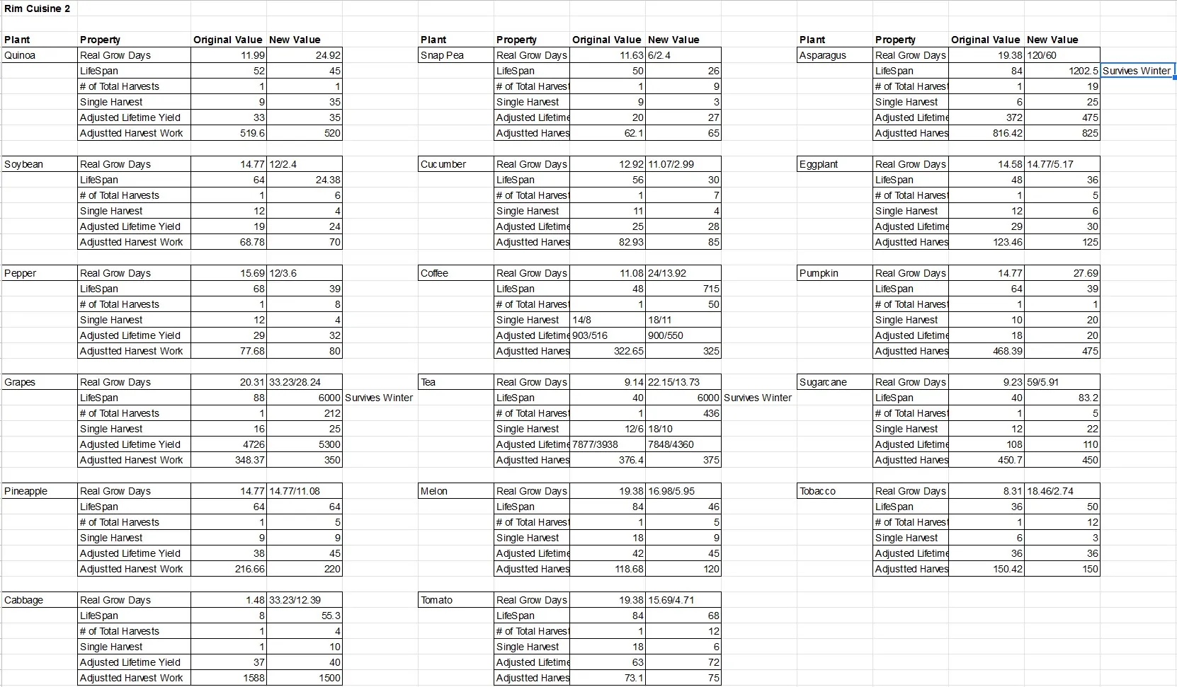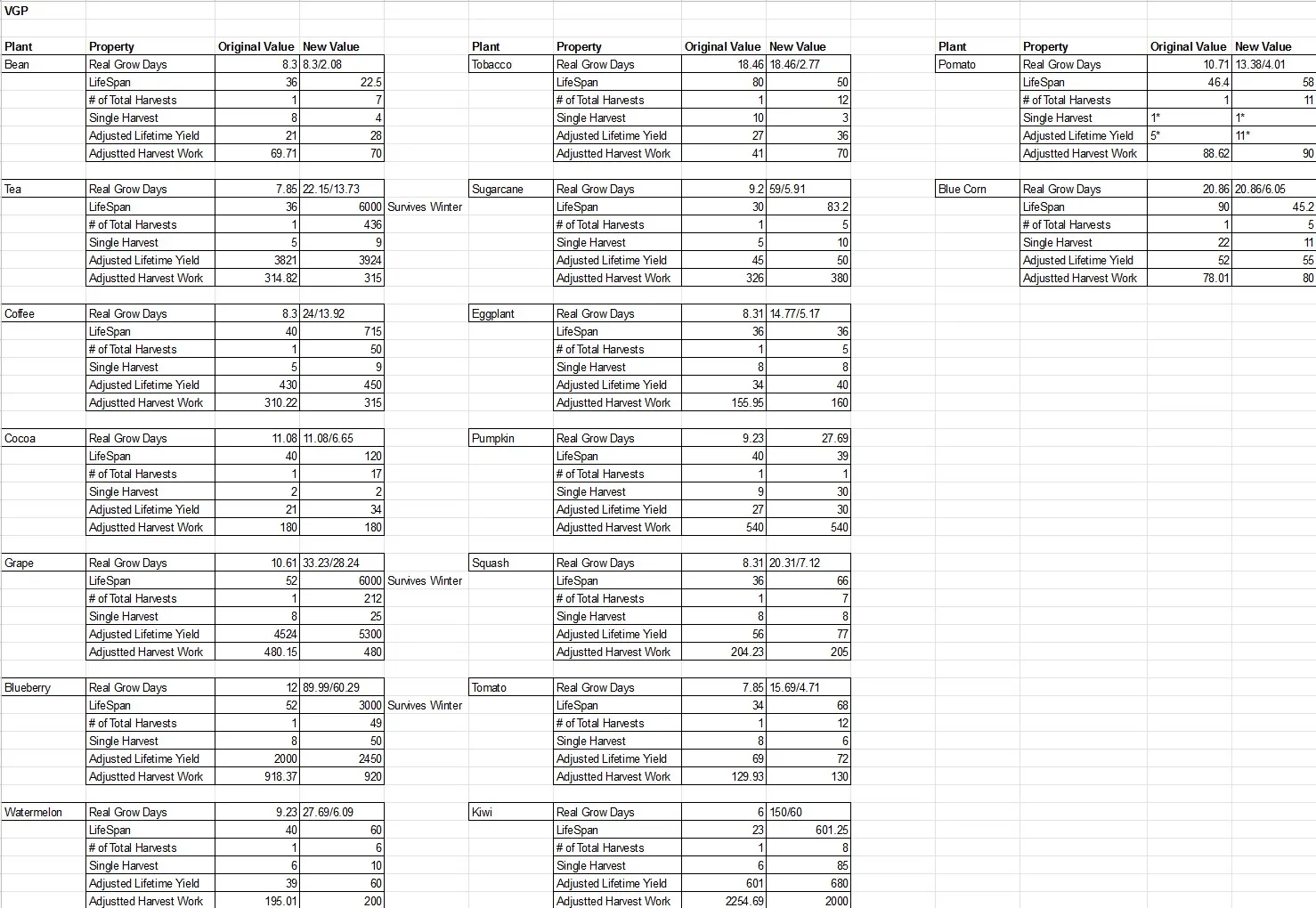I've done lots and lots and lots of maths and created a new scheme for plant growth/harvest cycles. This should result in changing your farm strategy significantly. You will want to balance short-growth plants with long-growth. I've done my best to mimic the real production cycles for most of these plants.
