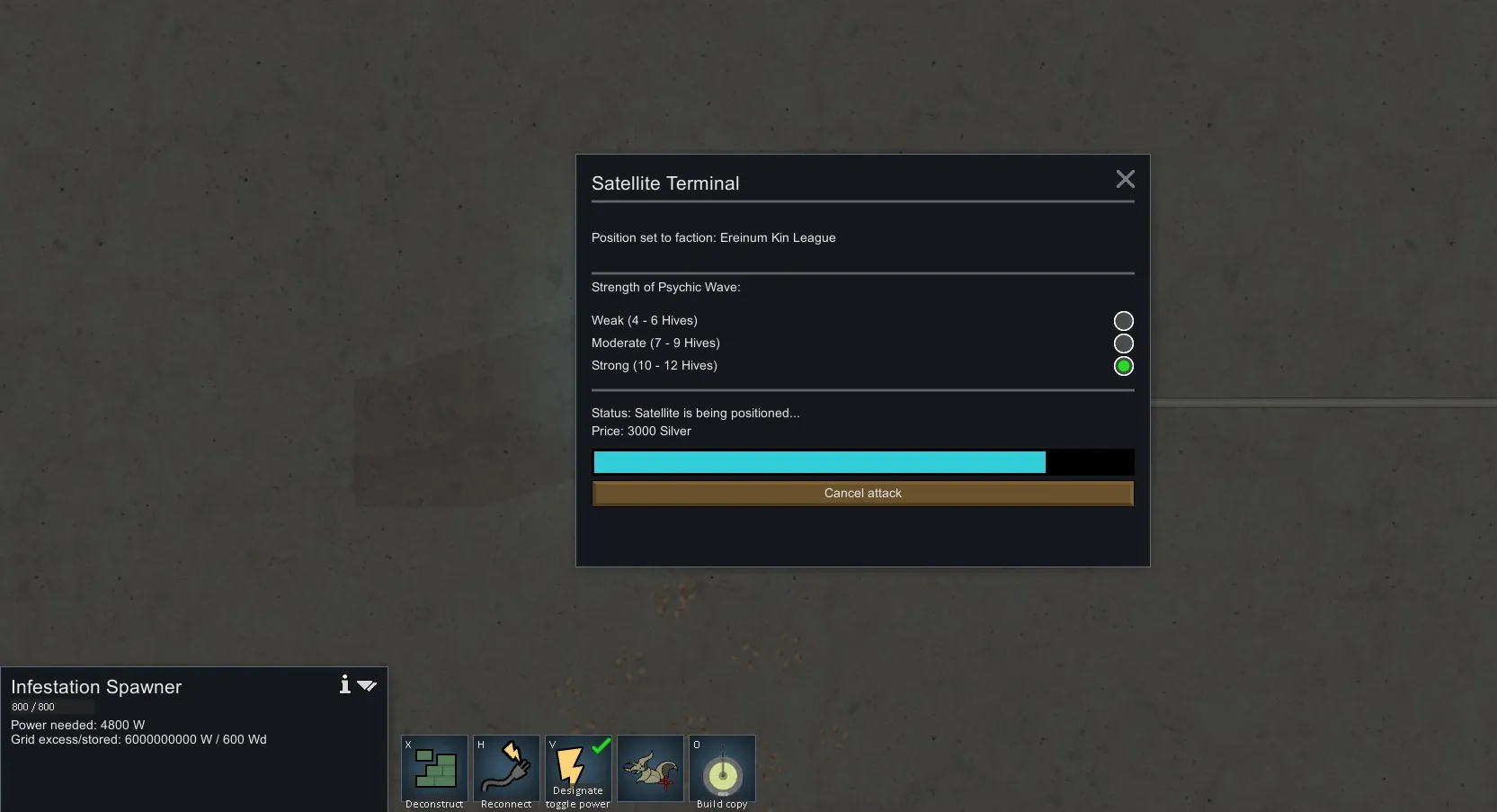 So this building acts as the sender to establish a connection to the mentioned satellite in orbit. From there you can launch an "Infestation Attack" to a faction or bandit camp. You can set the strength of the psychic wave in the terminal, but of course this service is not for free! The lowest strength costs 1000 Silver, Moderate 2000 Silver and the strongest 3000 Silver. (see screenshot)