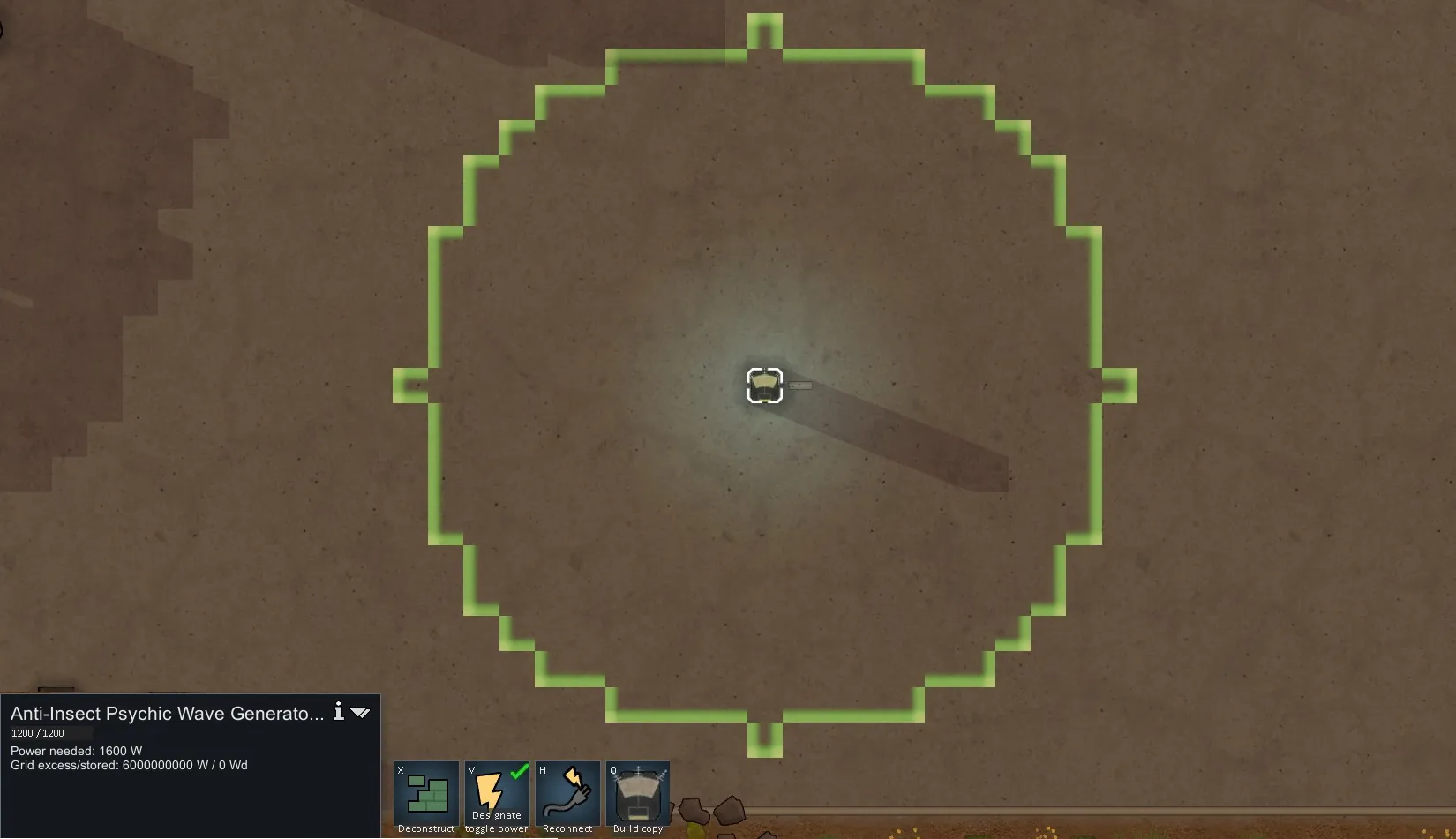 Like you can imagine from it's name, it completely prevents infestations! It needs 12000 W of power and due to the strong psychic waves it even impacts your colonists on the map! Every colonist will get a -10 mood debuff if the building is turned on. (Mood Debuff is changable in the mod settings! If zero, the thought will not be displayed.)