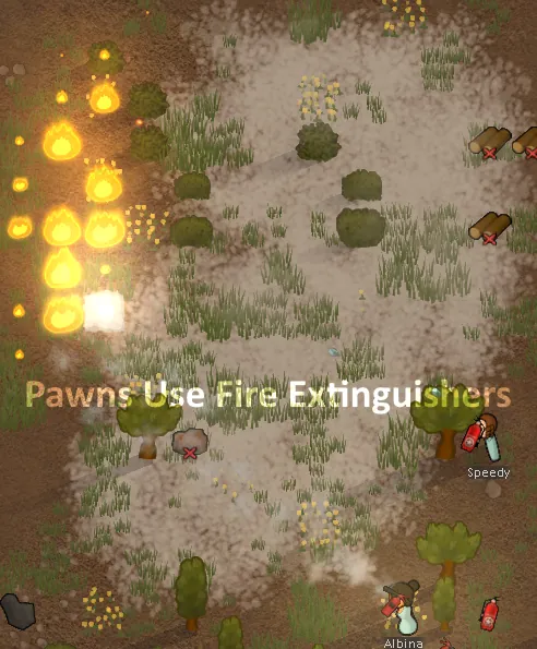 Allows fire extinguishers to be used for firefighting automatically. If a pawn doesn't have a fire extinguisher or a piece of fire can't be accessed with a fire extinguisher, pawns will go back to default vanilla behavior of beating out fires.