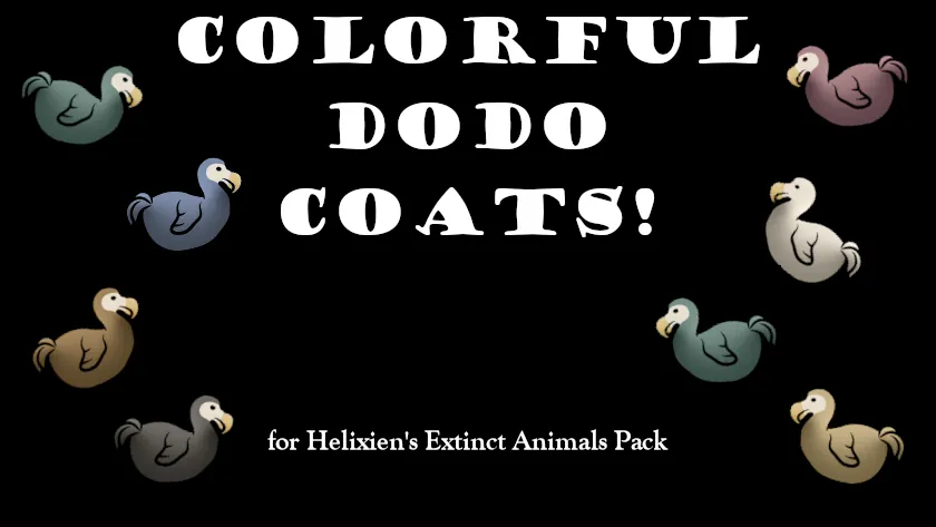 This is just a handful of color variations for the cute lil dodos from Helixien's mod. You need [url=https://steamcommunity.com/sharedfiles/filedetails/?id=2266685892]ReGrowth: Extinct Animals[/url] for this mod to have any effect (will also work with the older versions, ReGrowth: Extinct Animals Pack or ReGrowth Remastered: Extinct Animals if you are still using those for whatever reason). Inspired by the Animal Variety Coats mod! Original texture is by Erin!