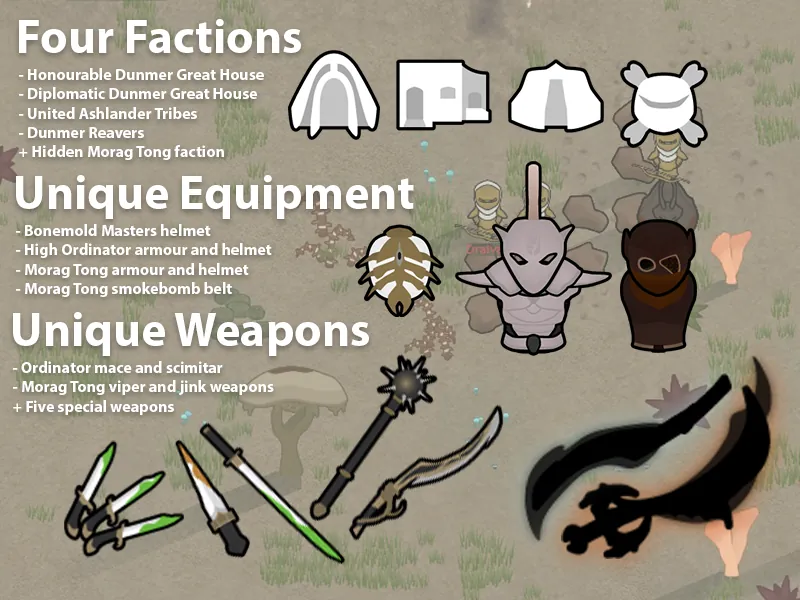 Several of the new pawn kinds come with custom equipment, including High Ordinator armour, ordinator maces and scimitars, and an assortment of Morag Tong equipment. Dunmer masters and Morag Tong Grandmasters may also spawn in with special weapons that have unique effects.