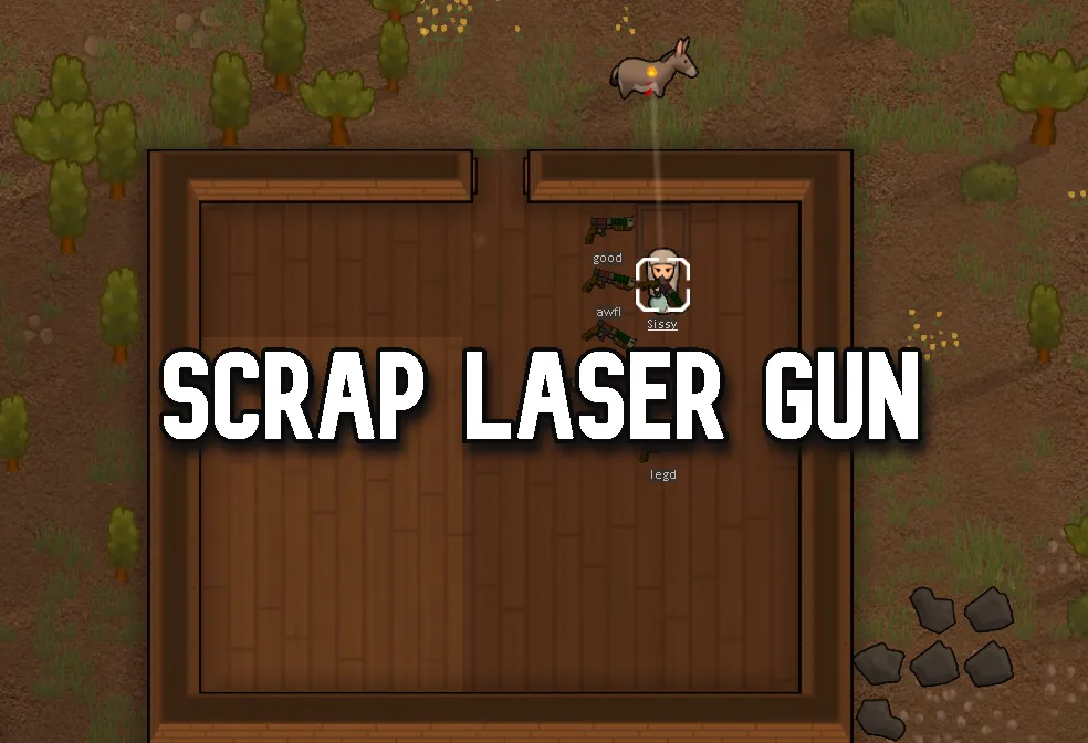 A junk laser gun made from scrap metal a bit of plasteel and a junk component that can be crafted at the crafting spot, will set fire to targets but not materials have fun.