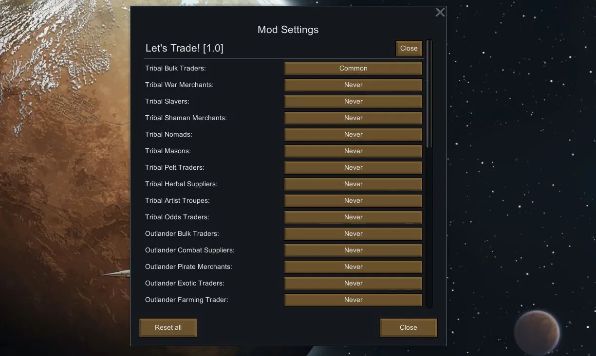 'Let's Trade!' adds more variety to RimWorld traders. A total of 25 new traders are added that use vanilla categories and trader tags that provide additional trade support for modded content. This mod also allows you to modify how often you see specific traders, allowing you to truly tailor your trading experience.