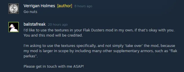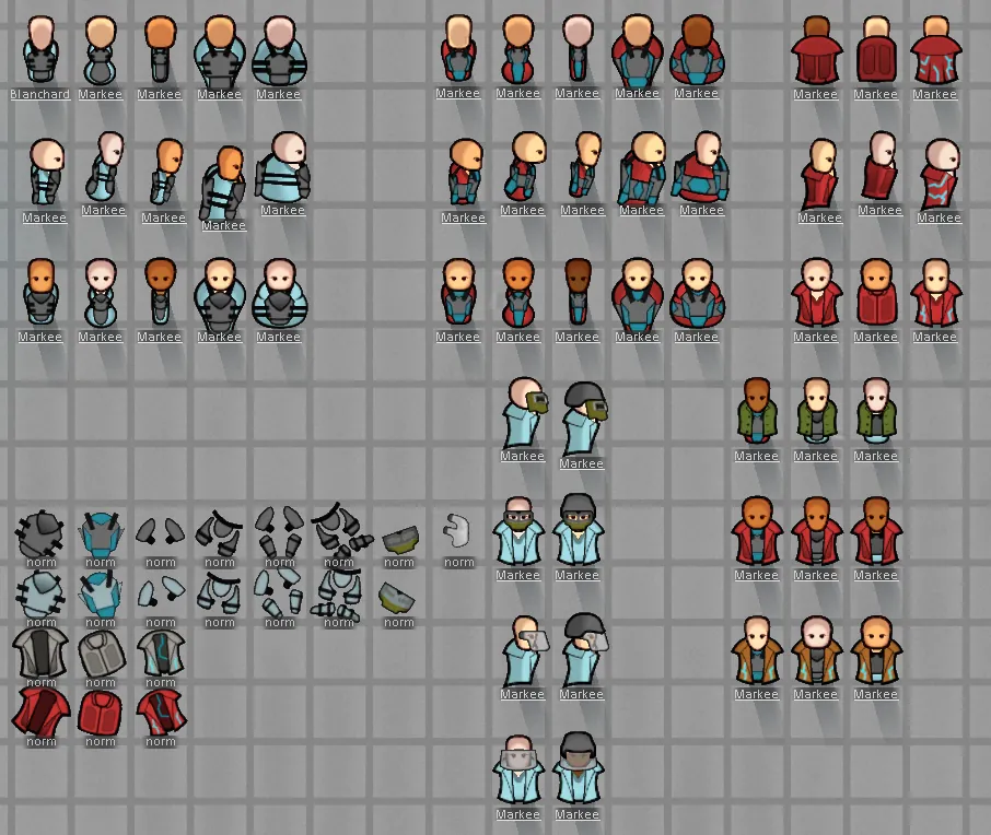 Faceshields, the flak parka, and the frontier longcoat were drawn by the humorously named [url=https%3A%2F%2Fko-fi.com%2Ftmcguy%2F]Tittymcswaggy[/url][ko-fi.com], who also has his own selection of [url=https://steamcommunity.com/profiles/76561198026437881/myworkshopfiles/?p=1]Rimworld weapon mods[/url] on the Workshop.