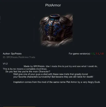 I made this mod just to try and learn to code. This mod was made with inspiration to a mod with the same name made by "very Angry Duck" and I highly recommend checking it out, yes his mod has problems with other enemies wearing the plot armor but this mod negates that effect by having the commonality of the traits set to 0.1 making it very improbable that an enemy will have it. (There is still a slight chance of an enemy having one or both traits, which is kinda cool knowing you can have your hero or villain fight theirs in a cool lil showdown)