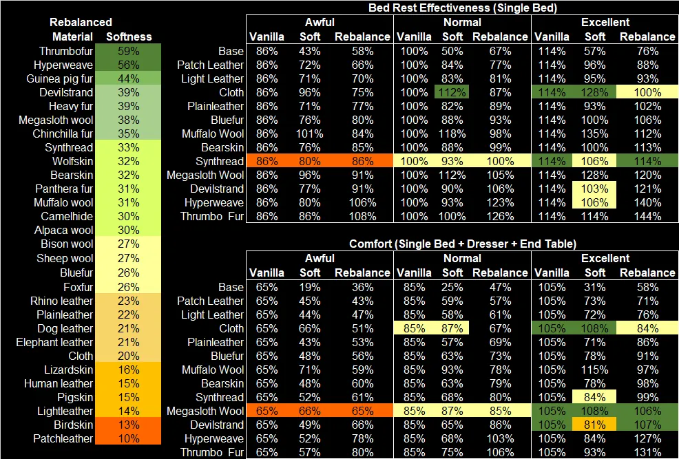 This mod makes two basic changes. First, beds without bedding aren't quite as punishing. Second, the softness value of materials are changed in an attempt to add progression and difficulty by making harder to obtain materials like Thrumbofur, hyperweave and devilstrand better than easily-obtainable materials like cloth and plain leather. See the chart for a comparison of vanilla, original, and rebalanced values.