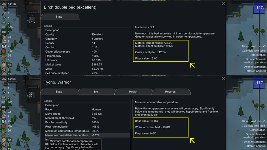 If you are using [url=http://steamcommunity.com/sharedfiles/filedetails/?id=1552507180]Psychology[/url], watch out for insomniac colonists. Since they're already wired to get less rest from sleep, these beds with reduced effectiveness can be especially destructive for them. Make sure they get a well equipped bed or they'll be sleeping all day long.