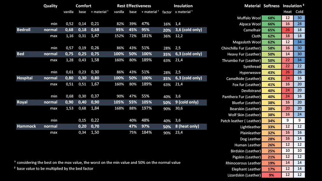 The result is that hard leathers and space-age synthetic fabrics, which are usually good for armor, are not that desirable to put on your bed. On the other hand, those weak fabrics that have a tendency to pile up as the game progresses, such as cloth and wool, make the best beddings. Check the table for the softness of vanilla textiles.
