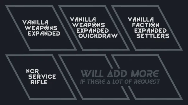 not compatible with other gun names changing mods which replace the weapon i mention from, because they will replace each other depend on load order