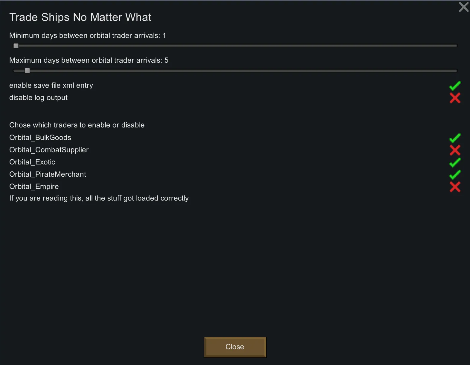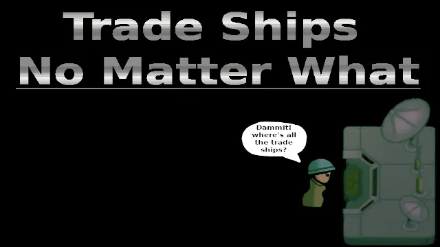 Tired of trade ships not showing up? Think it's stupid that you've only got 2 orbital traders in the 6 years of your colony's existence? Do you have mods that are breaking traders? Is the More Trade Ships mod not working for some reason? Is Randy being a ♥♥♥♥♥? Shocked how traders show up orders of magnitude less often in 1.2 than in 1.0? Well that's why I made the Trade Ships No Matter What mod. This mod does just what the name says. It triggers an orbital trader event every x days completely disregarding any and all other game code having to do with storyteller interaction, what's going on, mods that mess with traders or anything else. If you set this mod to spawn a trader every 3-5 days and put it at the bottom the your mods list, it will make a trade ship show up every 3-5 days no matter what.