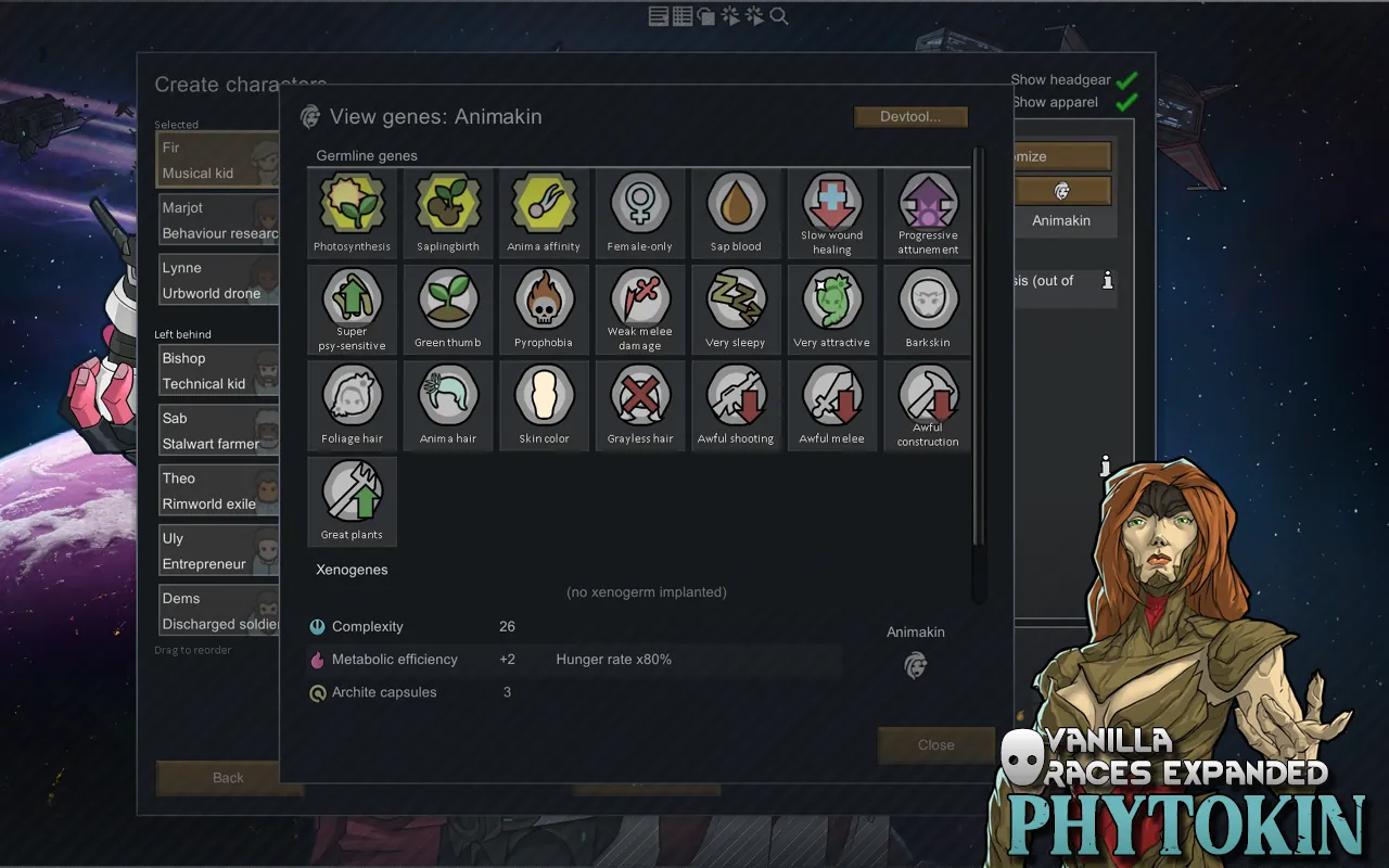 This mod adds a new race called Phytokins, which are a unique and extremely rare xenotype that mixes the DNA of a plant with human DNA. Phytokins are capable of photosynthesis and reproduce via planting a saplingchild, and come in three varieties based on what DLCs you have enabled. With no other DLC, the only Phytokin variety present in the game will be the evil Poluxkin.