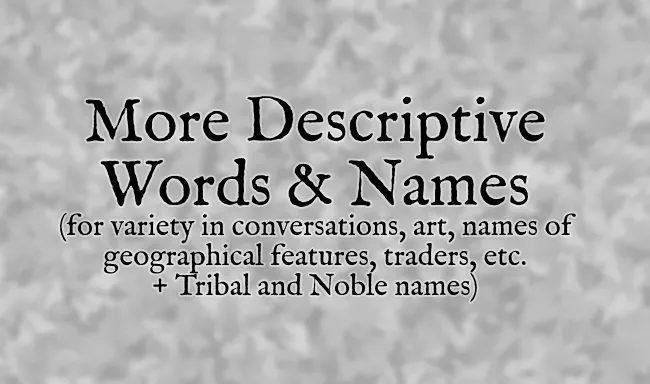 Adds a plethora of new words to add variety to the generated names of traders, settlements, map features, conversational topics, art descriptions, etc. This mod does not edit any of the generators (except to add gender-specific surnames for the Empire), just adds more words used.