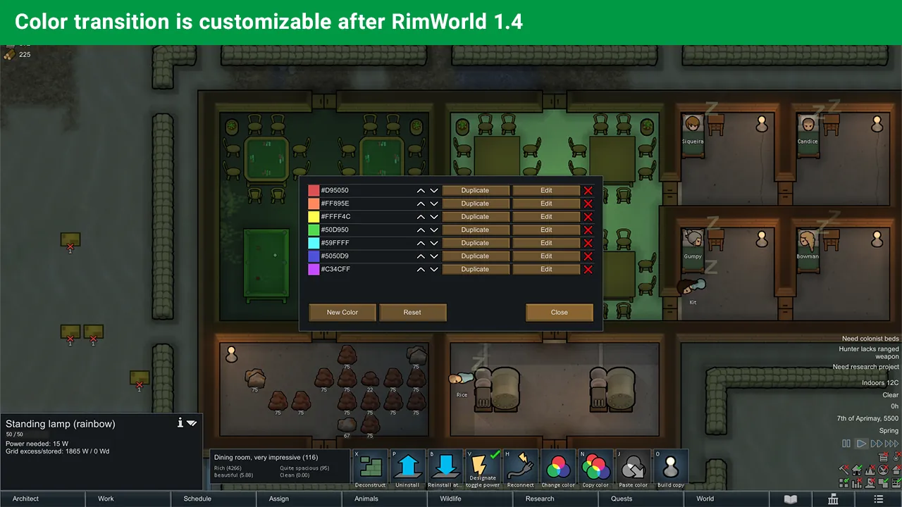 このMODは虹色に変化する照明を追加します。追加される照明はゆっくりと色を変化させながらあたりを照らします。ムーディーな部屋など、インテリアとしてどうぞ。追加される照明はバニラの研究「彩色灯」の履修後に建設できるようになります。