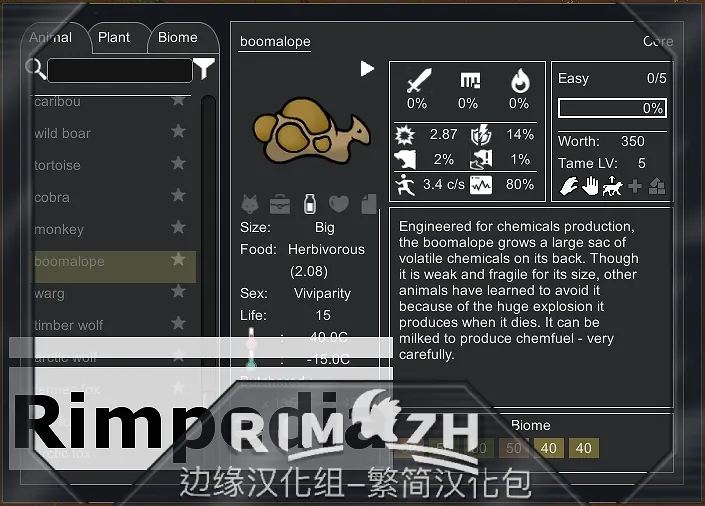 边缘百科的简繁汉化包,记录或是与动物互动能增加对它的认知,记录点数到达一定程度才能解锁情报,记录点数满了之后会获得驯兽和屠宰加成。