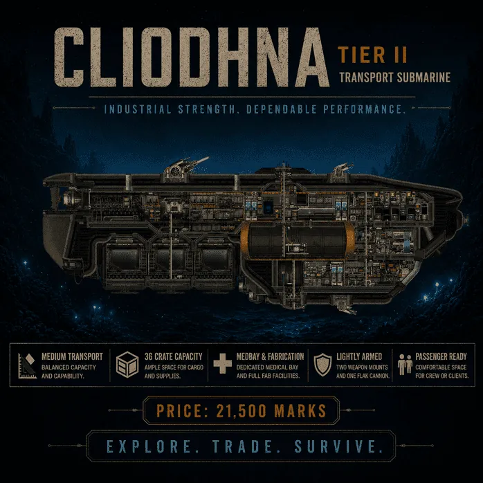 The Cliodhna is a medium transport submarine favoured by independent haulers operating along Europa's outer trade routes. Named after a forgotten ocean spirit of Old Earth, its unconventional mid-hull ballast grants surprising stability in turbulent currents. Equipped with a capable but modest defensive armament and on-board medical facilities, the vessel excels in long-haul cargo and passenger contracts, though its industrial heritage leaves little room for comfortThe Cliodhna is a rugged Tier II transport submarine commonly seen hauling freight and passengers between the scattered outposts of Europa. Built with an industrial-first philosophy, it favors reliability and self-sufficiency over speed or luxury. Its silhouette is unmistakable, with a reinforced mid-hull ballast tank that grants stable handling in turbulent currents, although sacrificing some agility.
