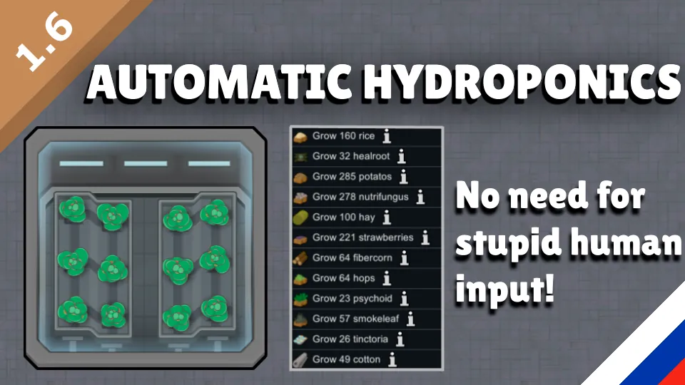 Добавляет новые высокотехнологичные гидропонные установки, которые работают полностью автоматически и не требуют ухода со стороны колонистов.
