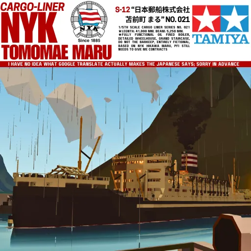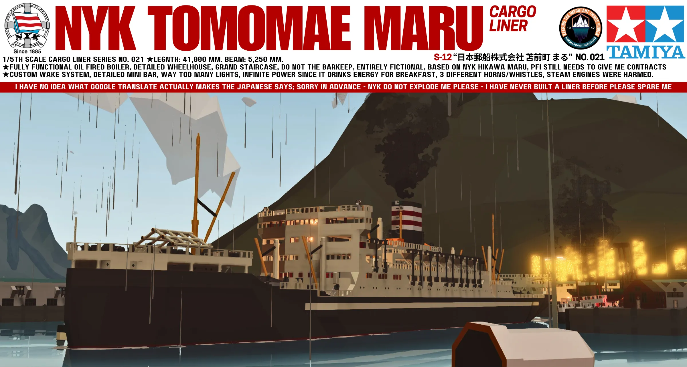 Launched in 1924 following her sister's Hikawa Maru success, she would be an oddity among her sister ships, electing for steam power over the diesels of the others. In 1936, she would be converted from her standard configuration (Cargo liner) to a hospital ship to support the Japanese invasion of China in the following years. After the Japanese surrender in 1945, she would be stationed to assist the city of Hiroshima until late September 1946. Afterwards, the ship would be relinquished back to NYK. It would be converted back into a cargo liner, starting runs under lease from the British and American governments from Japan to Alaska to help with reconstruction and ferry soldiers from the recent conflict back home. Unfortunately, on the night of April 10th, 1959, on a trip back to Japan, Contact with the ship was lost, and it is assumed to have sunk with all hands. In 1967, Permafrost Institute units, following reports of a Ghostly vessel situated between rocks and ice, would discover the wreck of NYK Tomomae Maru, a couple of miles East of the Chukchi Sea, Run aground with a gash going from bow to midship, wedged between a cliff face and an ice shelf. Since its discovery, the Permafrost Institute has been working to keep NYK Tomomae Maru's location unknown and restore/maintain NYK Tomomae Maru's structural integrity.