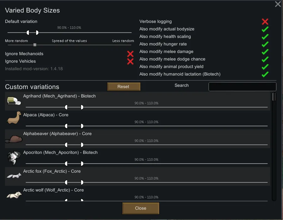 This mod adds some new settings to rimworld. It allows you to individually set a customized size range for all pawns and animal sizes. This change is strictly cosmetic and alters no other statistics of the pawn or animal.