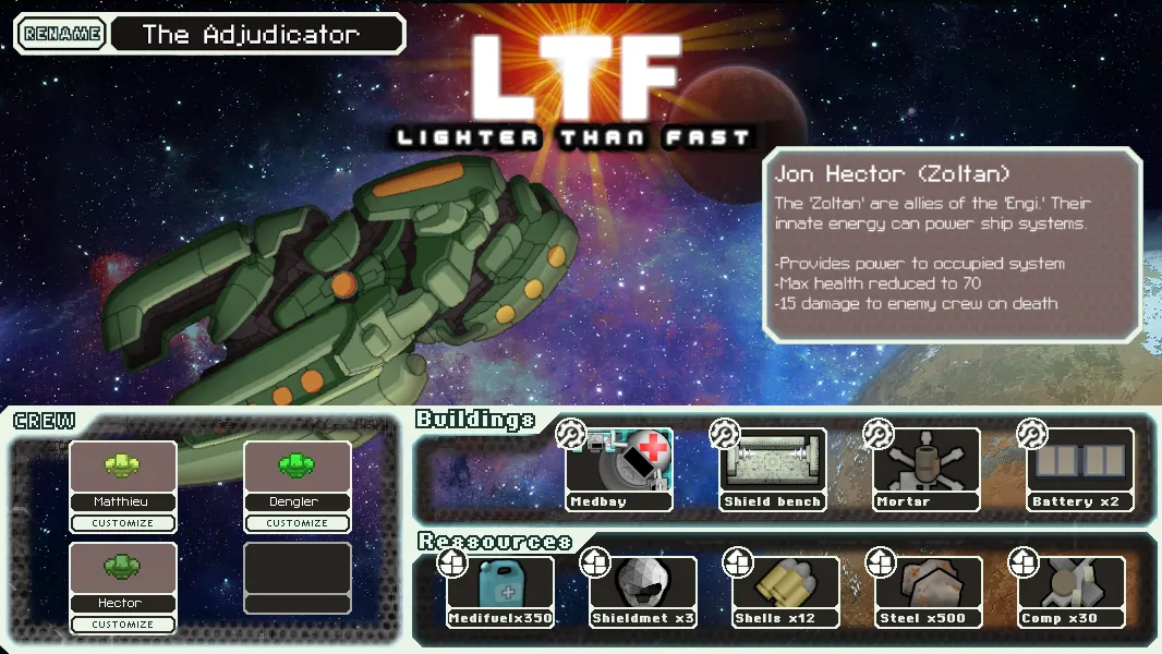 The Zoltan's advanced shields technology give this ship an edge during each battle. Unfortunately, It's crashed right now.