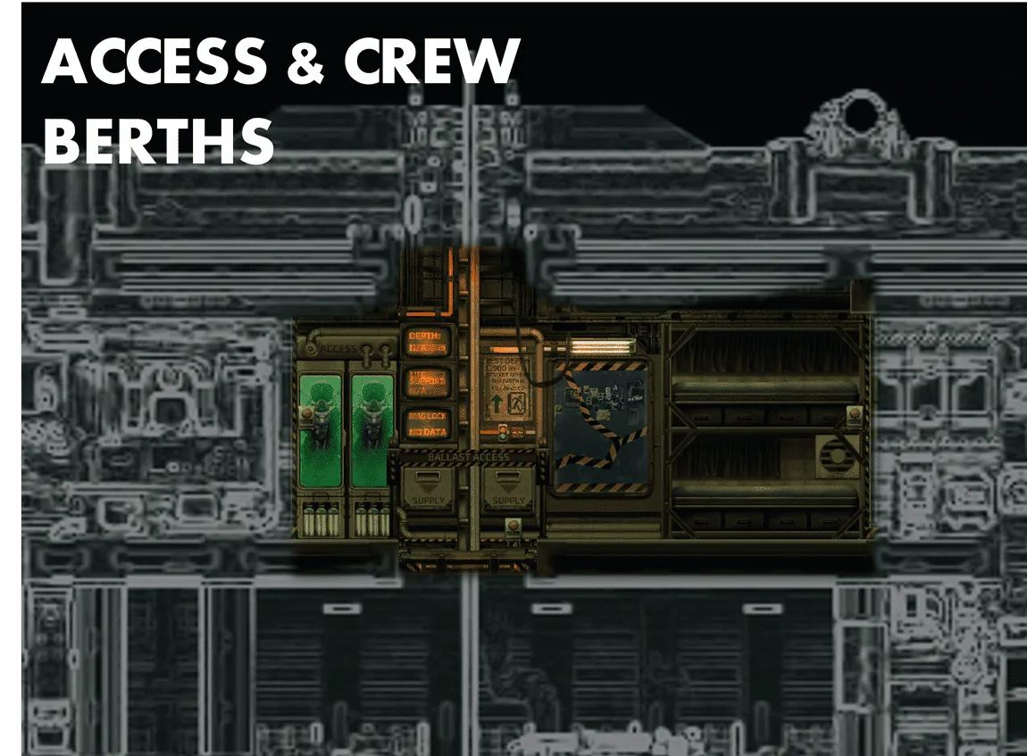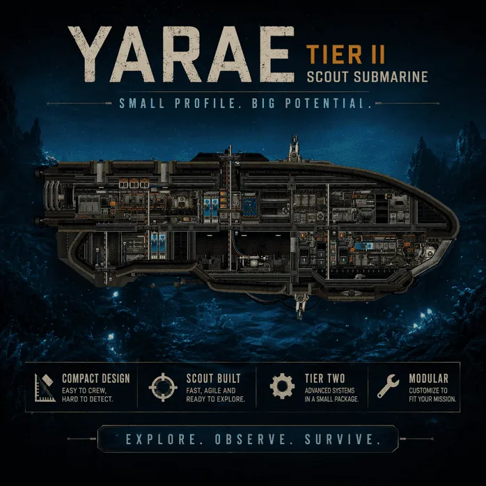 Yarae is a compact Tier II scout submarine built for efficiency and adaptability in hostile depths. Its streamlined layout supports a small crew while maintaining full operational capability, including advanced power distribution, fabrication and two weapon hardpoints. Well-balanced compartments and clear access routes make it easy to manage under pressure. Designed for exploration and quick response, Yarae delivers reliable performance in a tight, versatile package.Designed for the harsh trade routes of Europa, the Yarae is a compact Tier II scout submarine built for crews that value efficiency over brute force. Its streamlined interior supports a small team while still offering full fabrication capability, making it well-suited for independent expeditions beyond the reach of larger fleets. Reliable power distribution and a clean, practical layout reflect modern Coalition engineering priorities.