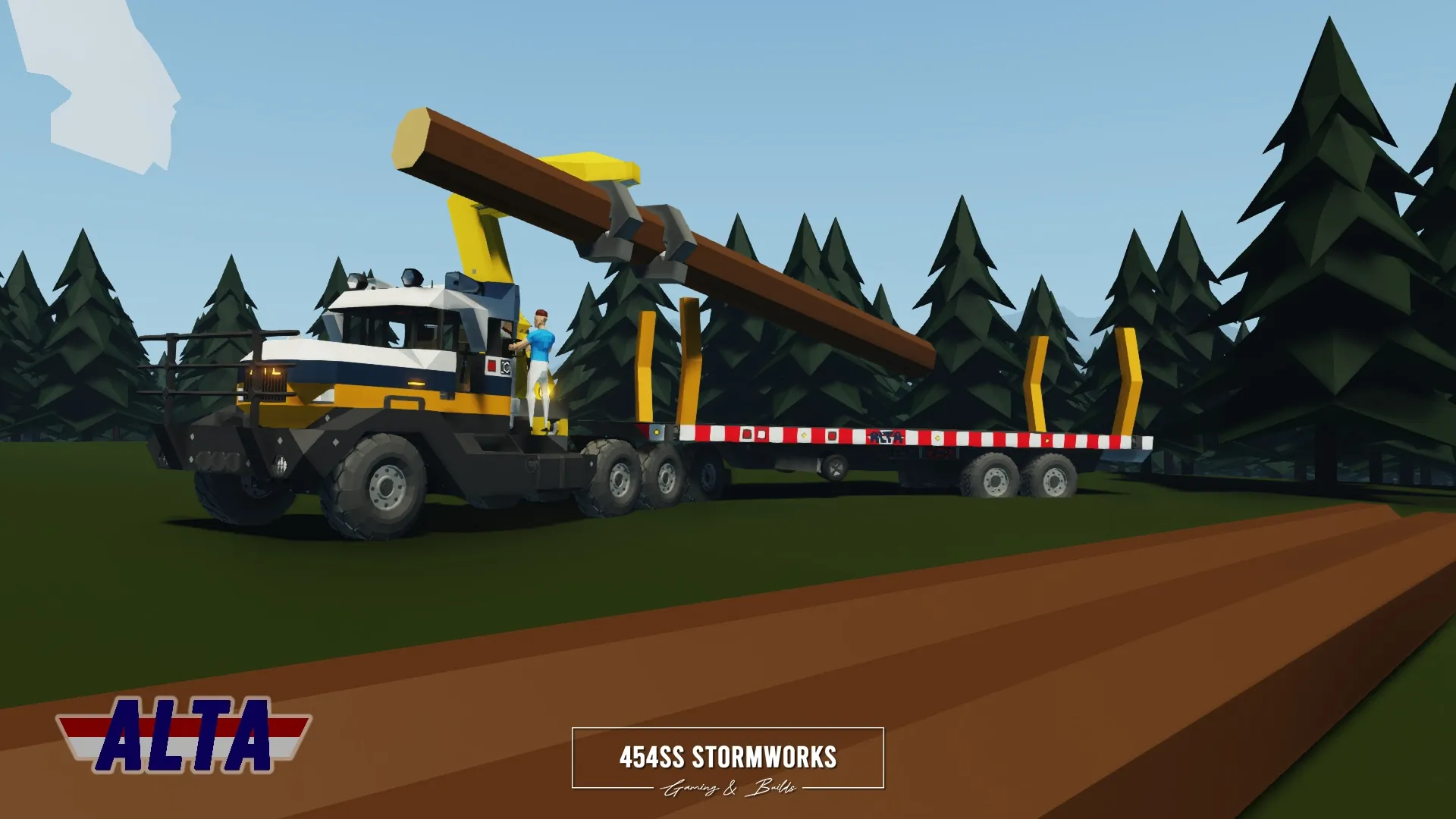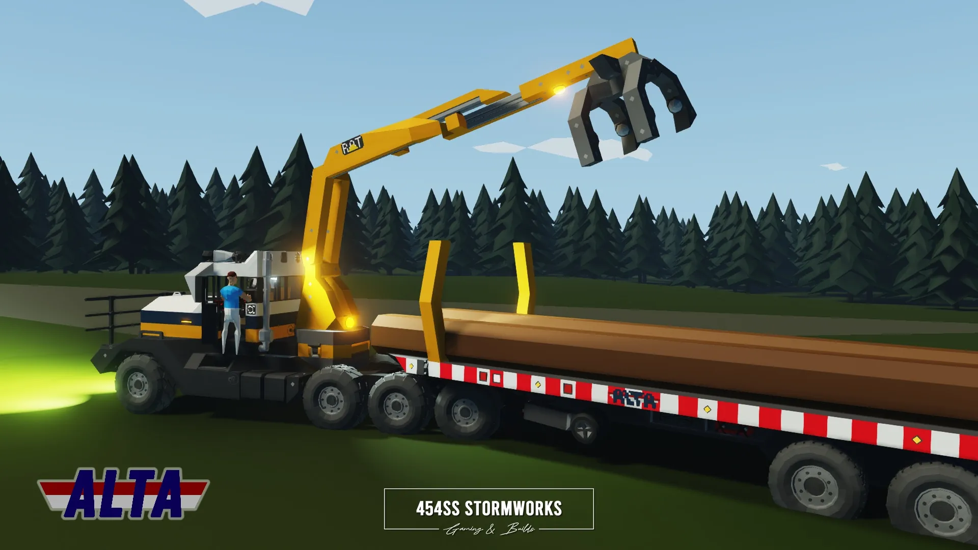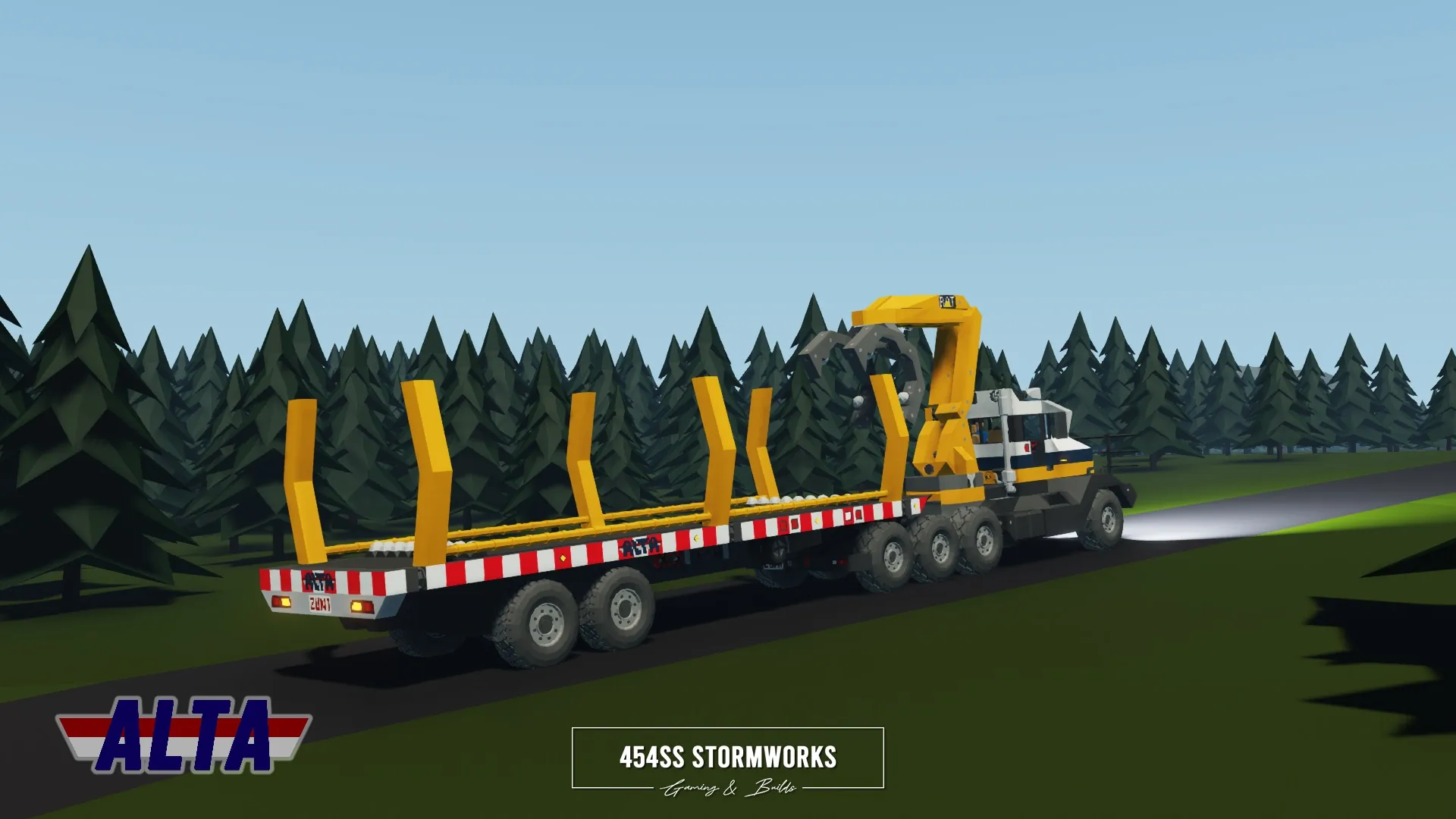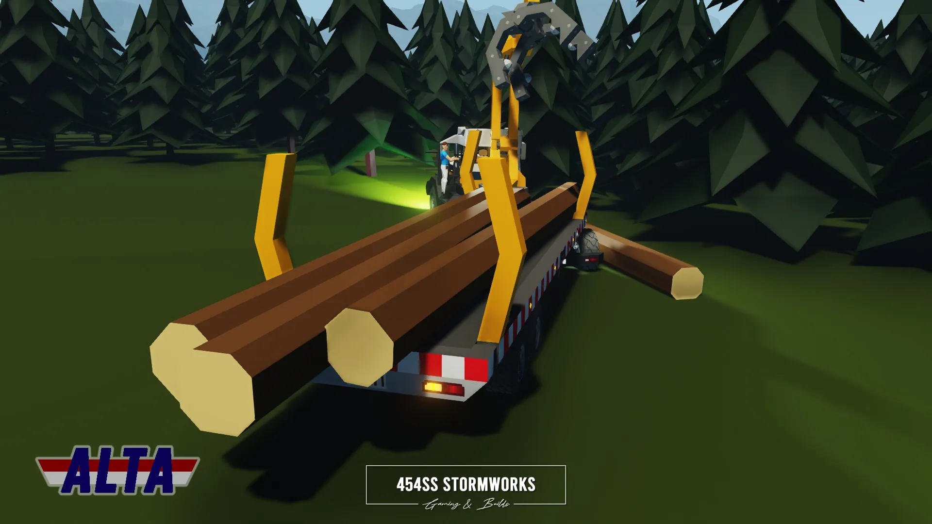 Heavy-duty log transport trailer owned and operated by ALTA Industrial Corp., a (fictional) mining, drilling and transportation company. The tow vehicle is required to be HGS/SIBTaT Standard Compatible to ensure full connectivity and all the features, including braking and lights. The trailer is also eBoost equipped, which if turned on by a eBoost compatible truck, can allow the trailer to provide power to its wheels.