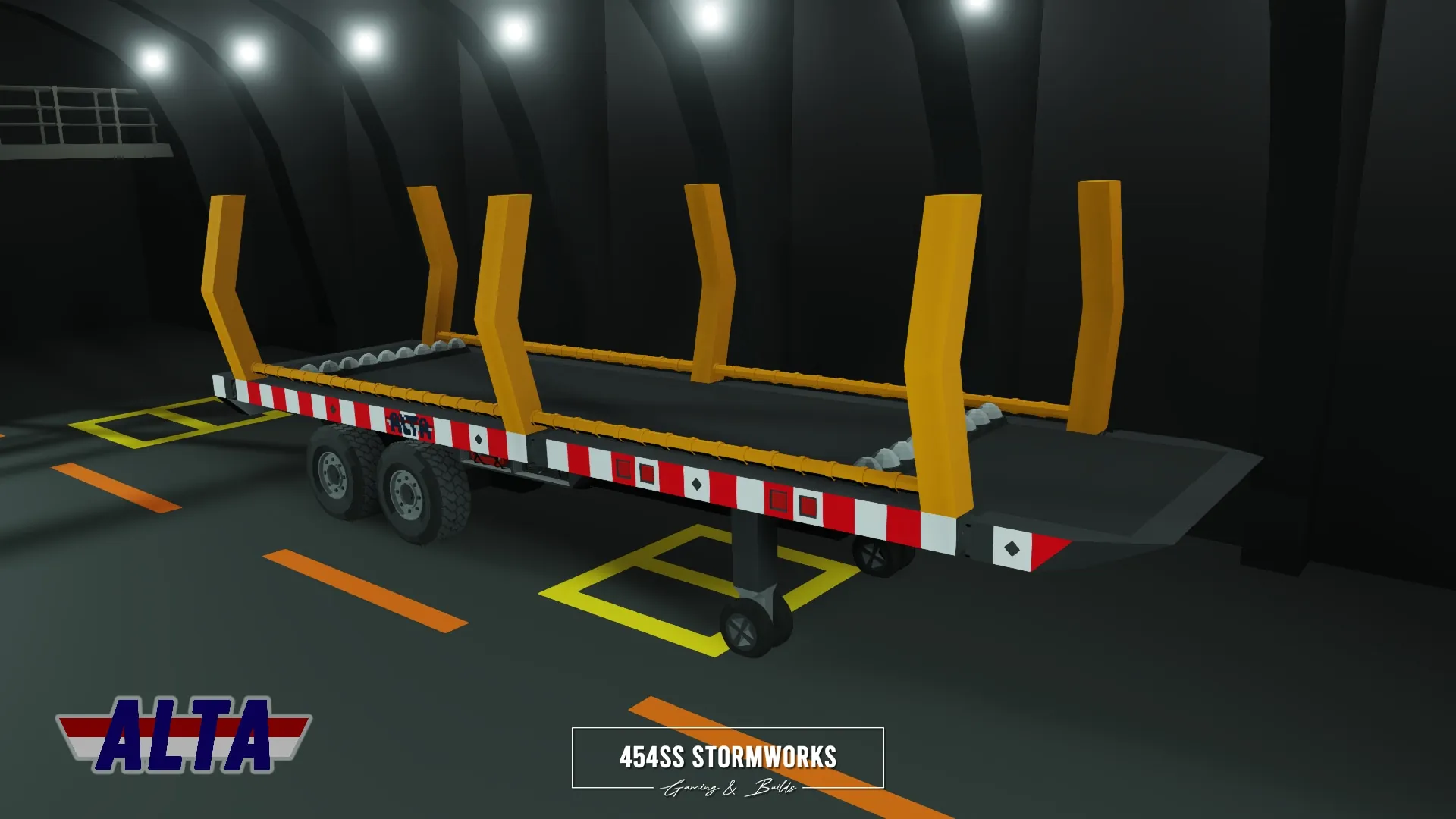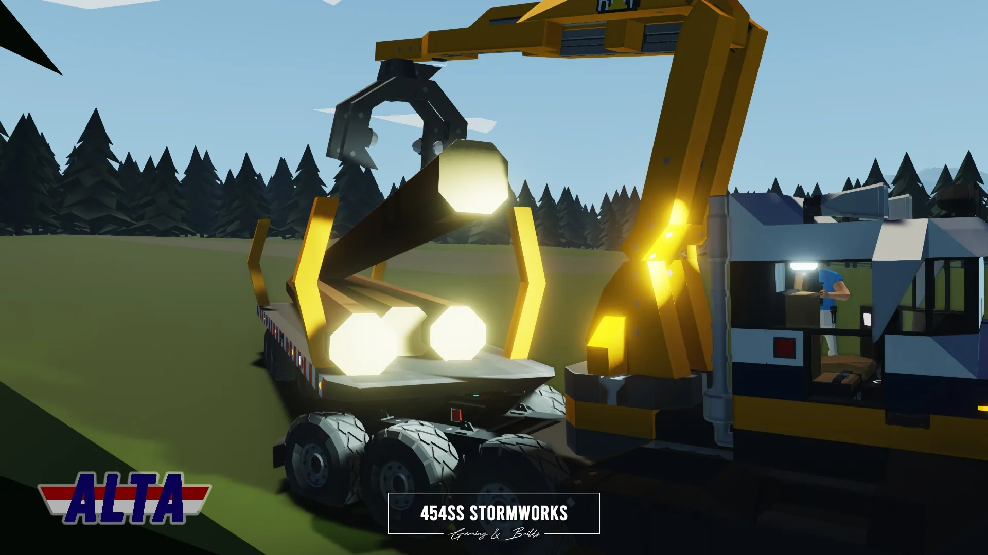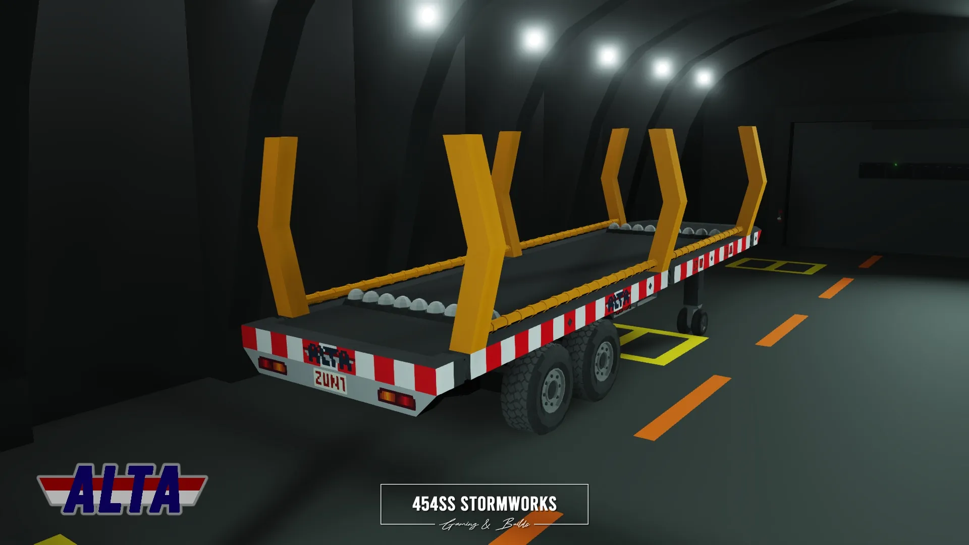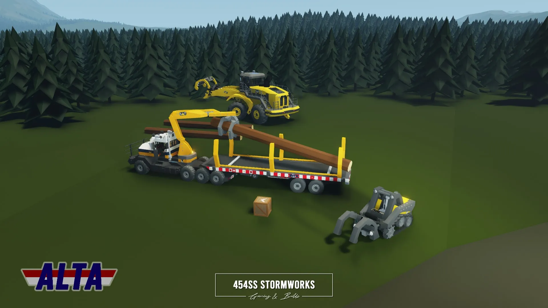 Heavy-duty log transport trailer owned and operated by ALTA Industrial Corp., a (fictional) mining, drilling and transportation company. The tow vehicle is required to be HGS/SIBTaT Standard Compatible to ensure full connectivity and all the features, including braking and lights. The trailer is also eBoost equipped, which if turned on by a eBoost compatible truck, can allow the trailer to provide power to its wheels.