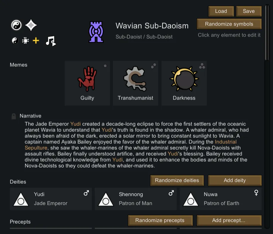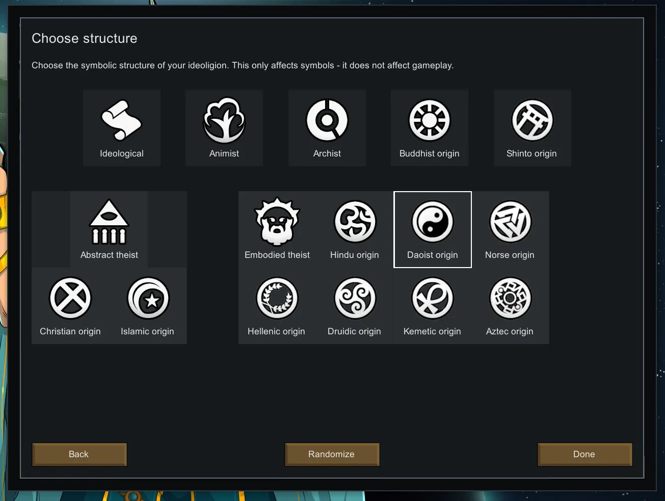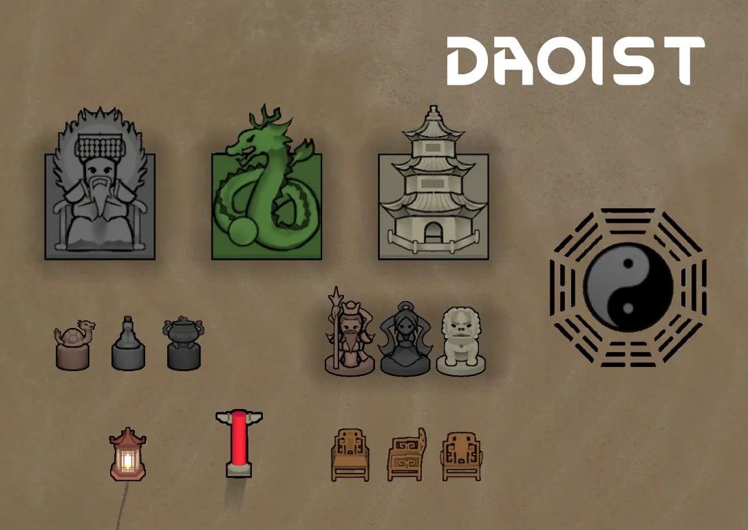 Currently Daoism, Shinto, Norse, Hellenic (Greek), Kemetic (Egyptian), Aztec, and Druidic (Celtic) are implemented.