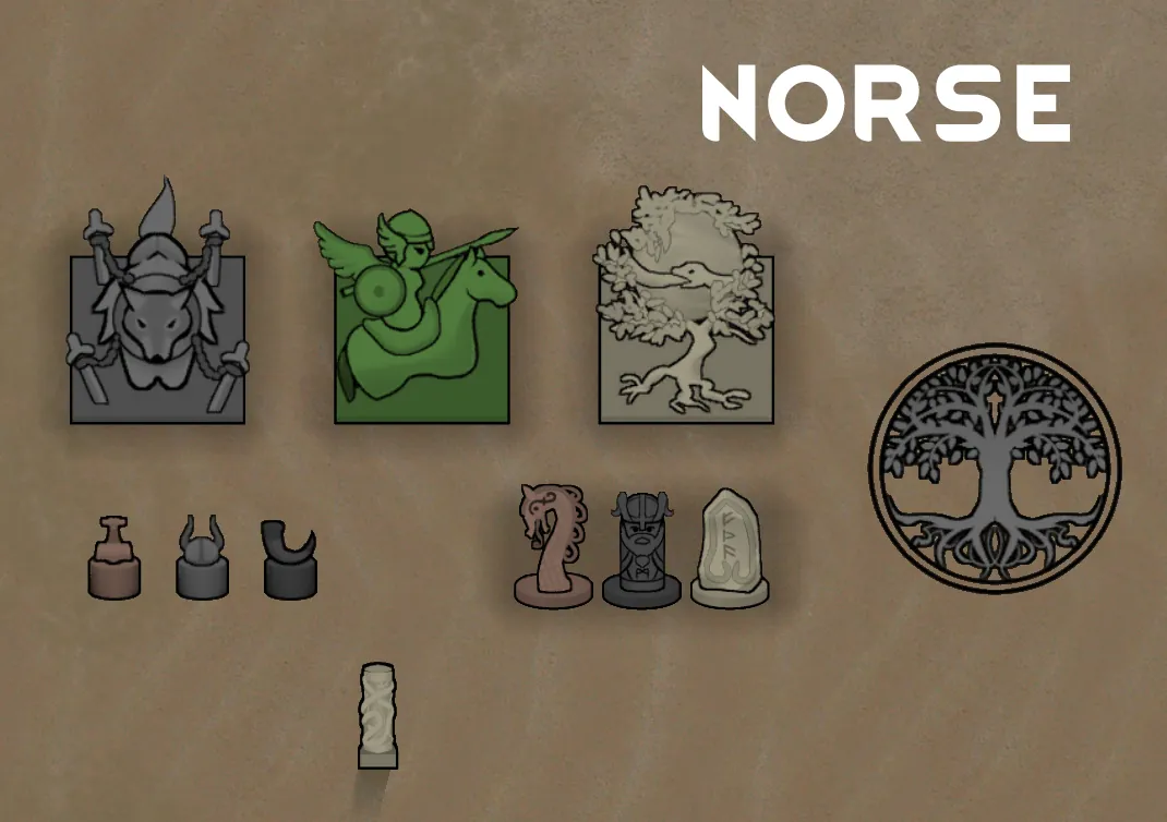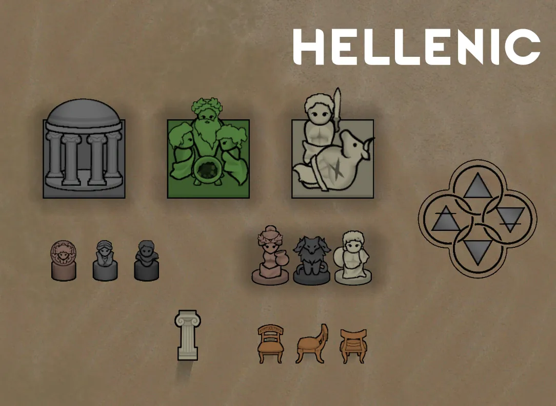 This mod adds more structures based on real world religions, and some styles associated with them. Styles include sculptures and ideograms, and architectural elements like chairs, columns, and lamps