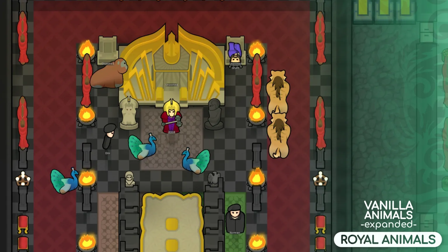 With Vanilla Animals Expanded - Royal Animals we are adding a decent selection of animals important in one way or another to the Empire. From poultry that turns any meals into lavish meals, to orangutans that can educate your colonists, this mod should greatly enhance your Royal playthroughs.