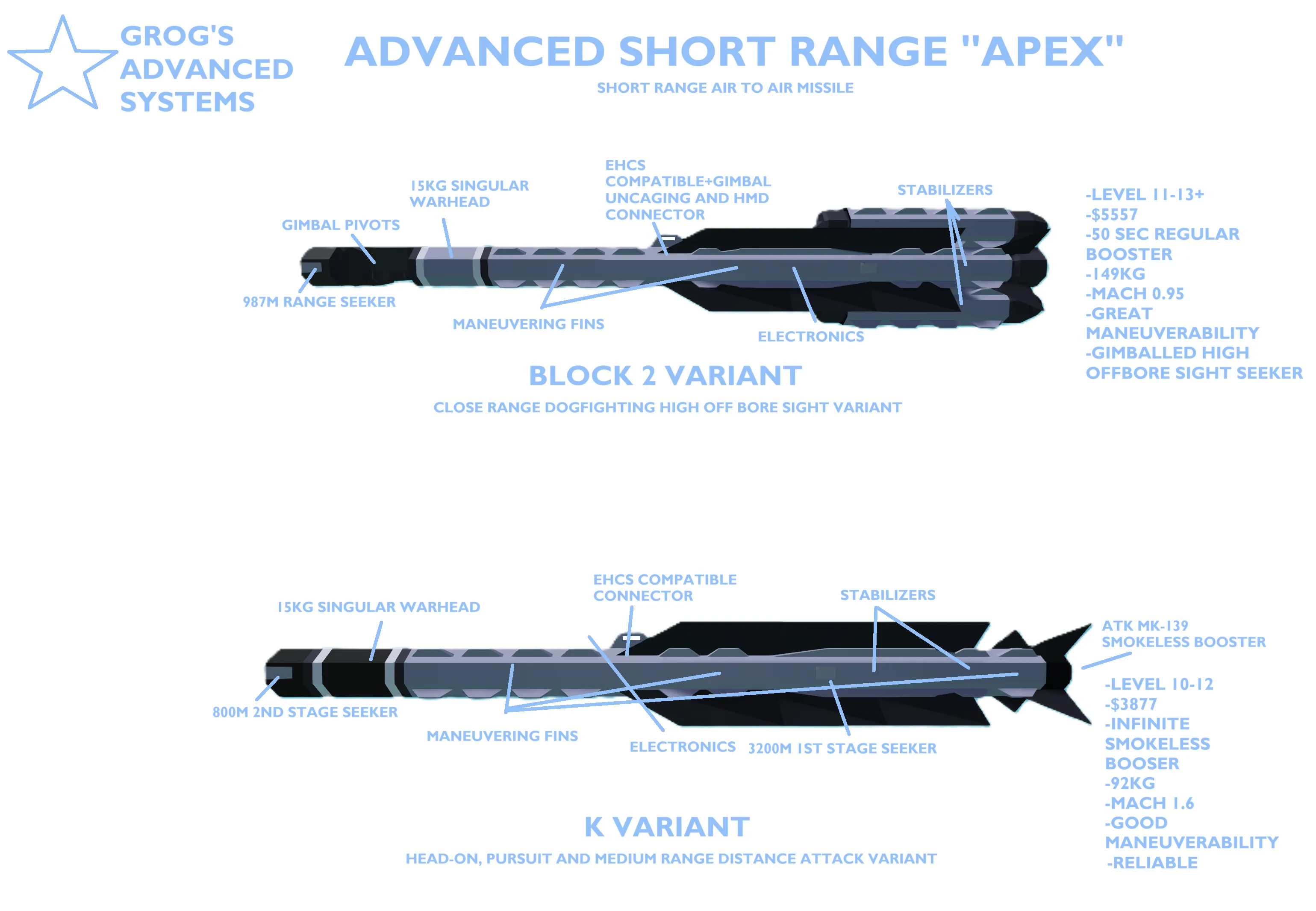 After more years of research, testing, failures, disasters, the true first and successful GASco missile was made. It was called the ASR(advanced short range)-APEX as it had a new body and electronics. It was much better however developers weren't satisfied with it yet so they created 2 variants:the block 2 which has more maneuverability and larger seeker hence also known as the dogfighting variant and the K variant which had a smokeless motor and alot more reliable which is known as the non-dogfighting head-on/pursuit fast variant.