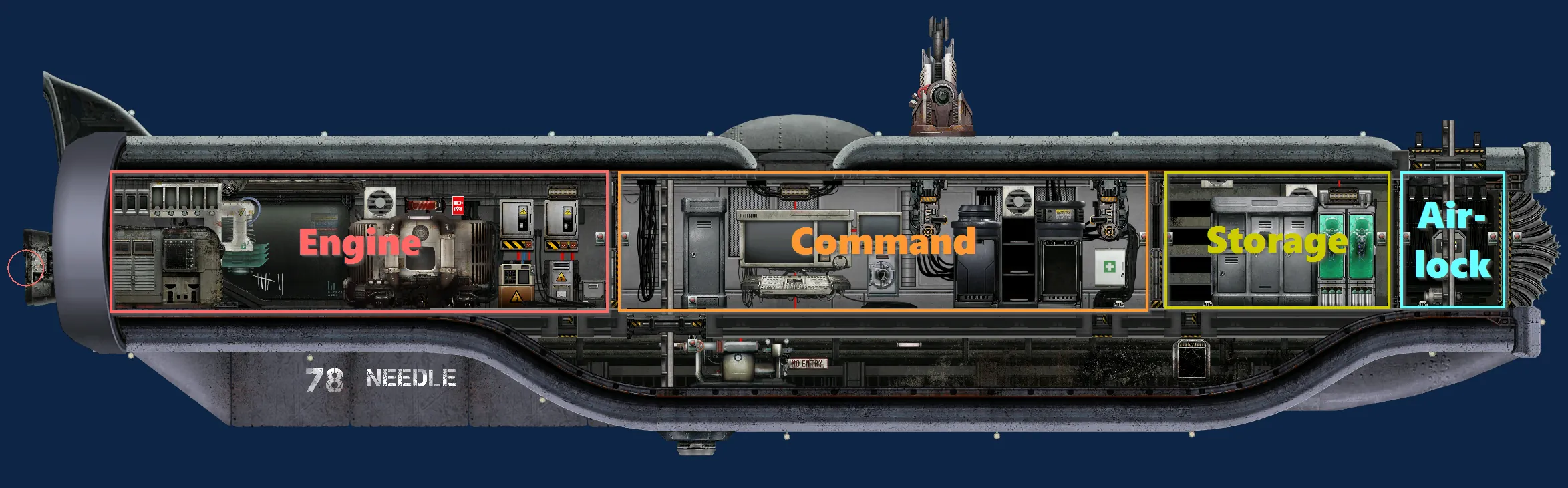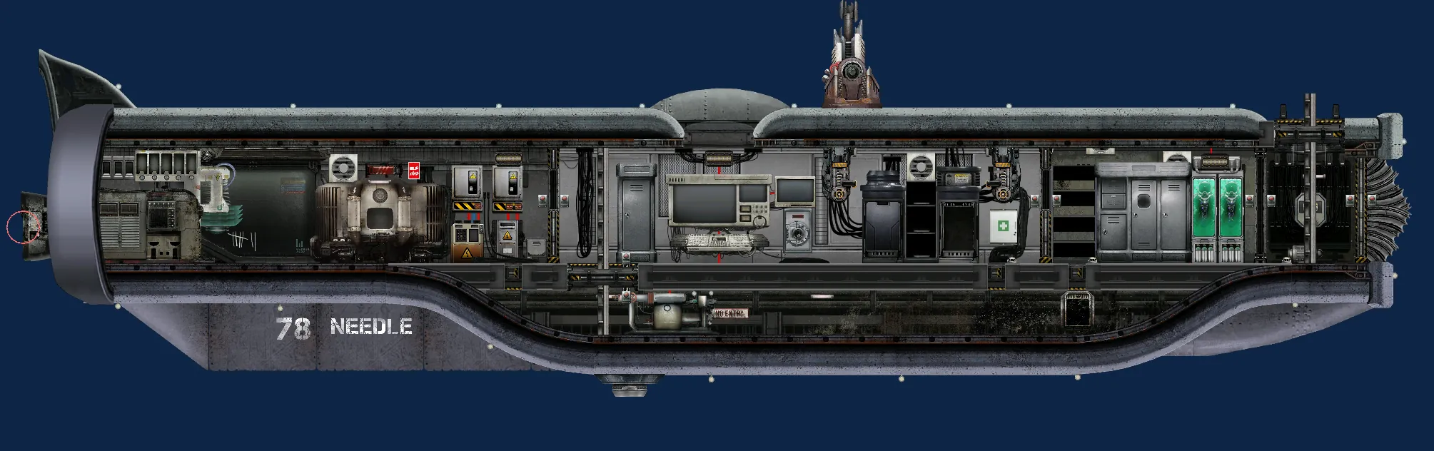 Nimble little transport for low-budget small crews. This tiny sub might not be the fanciest, but she has three advantages: she’s responsive, everything is on one single floor, and she’s very cheap. A perfect entry-level submarine for fresh crews.