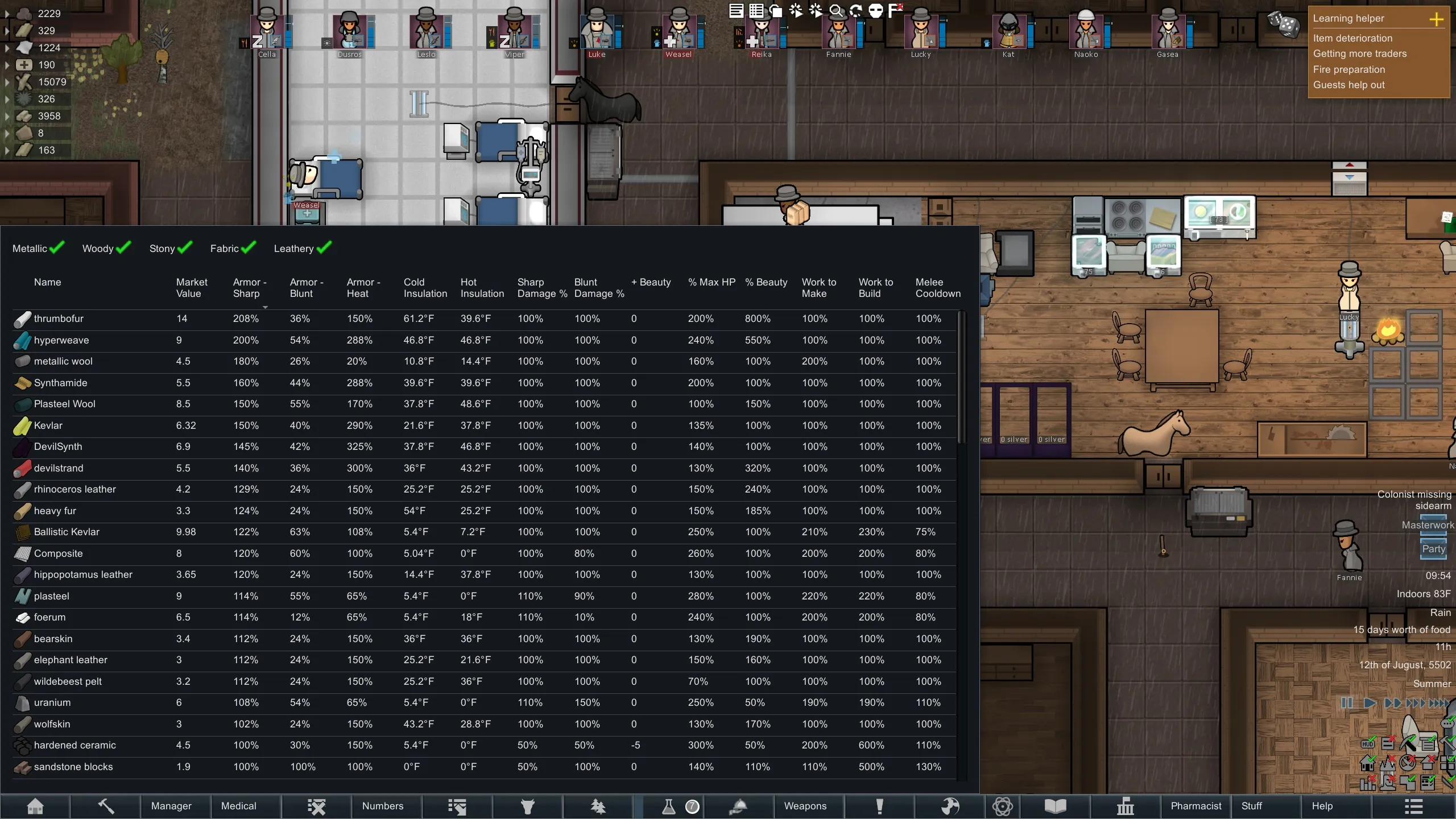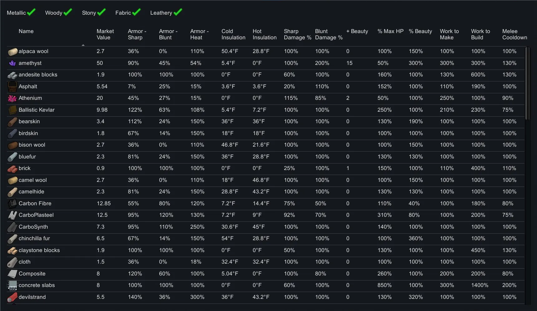 This is a tool to compare stats for stuffs, for when mods add a whole bunch of new fabrics, metals, etc. and you can't remember what's the best to make things with.