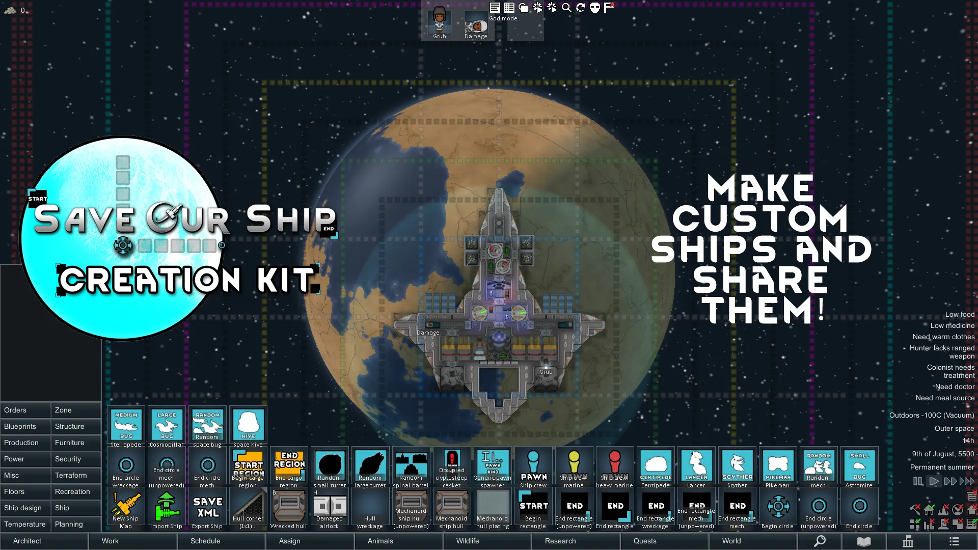 Save Our Ship 2 is an unofficial expansion for RimWorld. Build a liveable spaceship and continue your colonists' stories in orbit – engaging in ship-to-ship combat with pirates, searching derelicts for treasure, and perhaps even discovering a phenomenal cosmic secret or two! SOS2 includes two custom endings: build the Johnson-Tanaka drive to transport your colonists to a different rimworld for a New Game+ experience, or evolve one of your colonists to machine godhood using the Archotech Spore.
