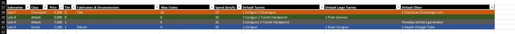 The Lee-T or "Mini Camel" as many enjoy calling it is a pseudo class of sub created by heavily modifying a Lee-A to haul cargo. The original's vastly oversized engine has more than enough power to lug around even a standard cargo pod, a fabricator, and a far more reasonable armament whilst maintaining a respectable (if far slower) speed.