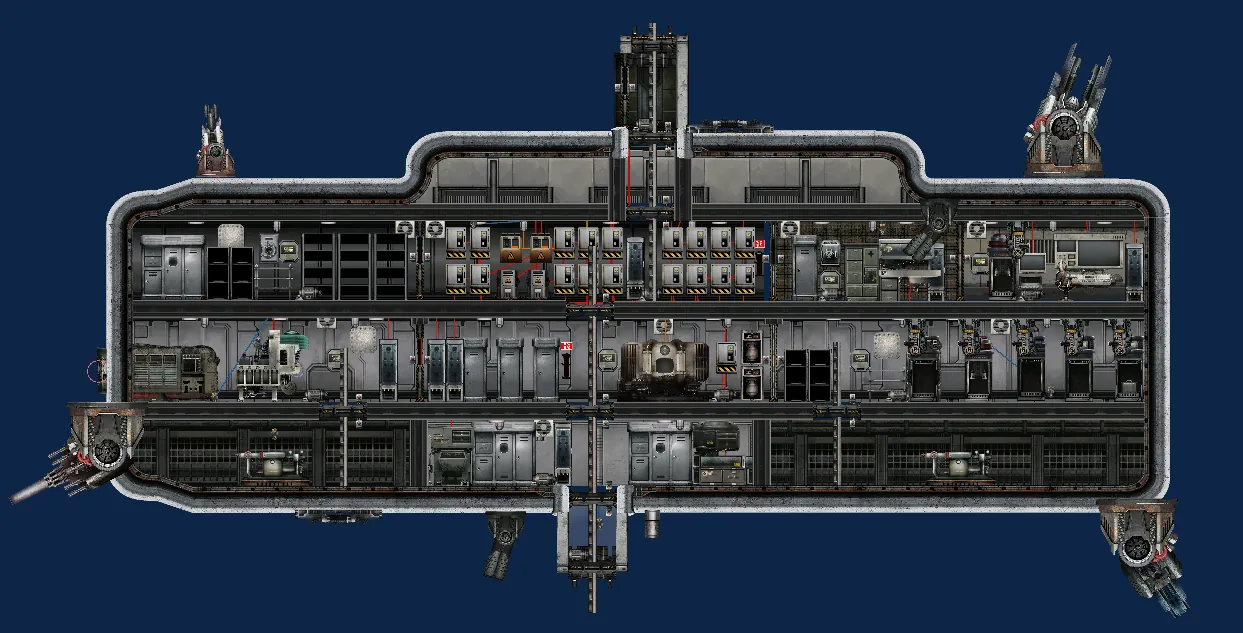 "Sciah", or flag for those who are unwilling to learn superiour belarusian language is a very high quality sloppy terribly made submarine, that is coinscidencially the first sub i ever made. It's not exactly op, but it has 5 turrets cuz why not. Also 1 of the coilguns is loaded with the suitcase full of cyanide which can be used to poison someone idk. Additionally it has a (idk why, but its not exactly 100% proof: some walls still remain broken, should get fixed when mechanic will make higher quality fixfoams) captain controlled full hull seal using 5 detonators with fixfoam grenades. The button responsible for it for the same contingent of people who don't wish to learn culturally superiour belarusian is the 2nd on the command panel. 1st shoots depth charges and third uses electric coil. Also just in case captain wishes to terrorise medic/to actually defend against a mutiny or intrusion there is a pulse laser that points on the medic so he doesn't become husk. Controlled from the captain's room.