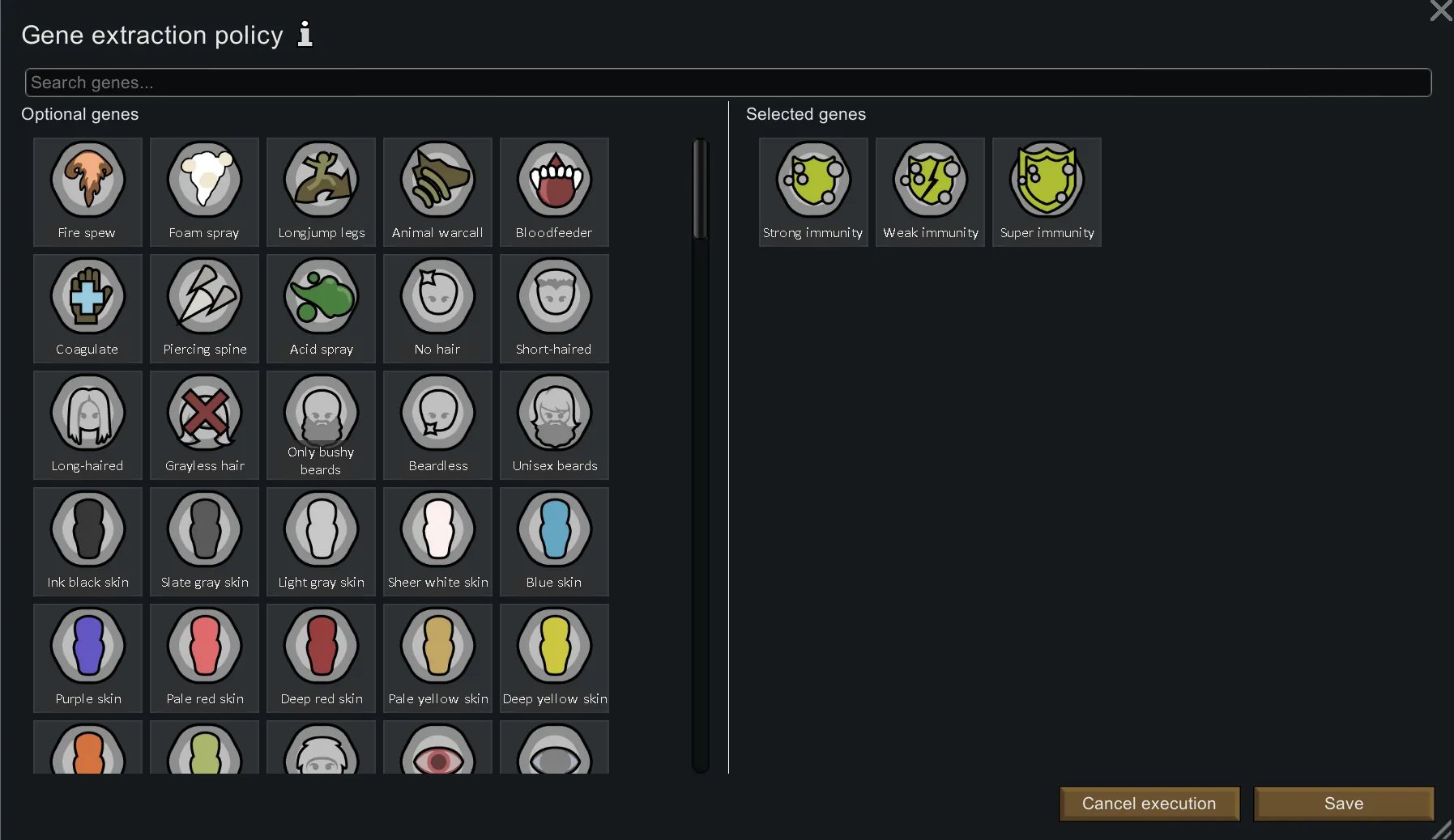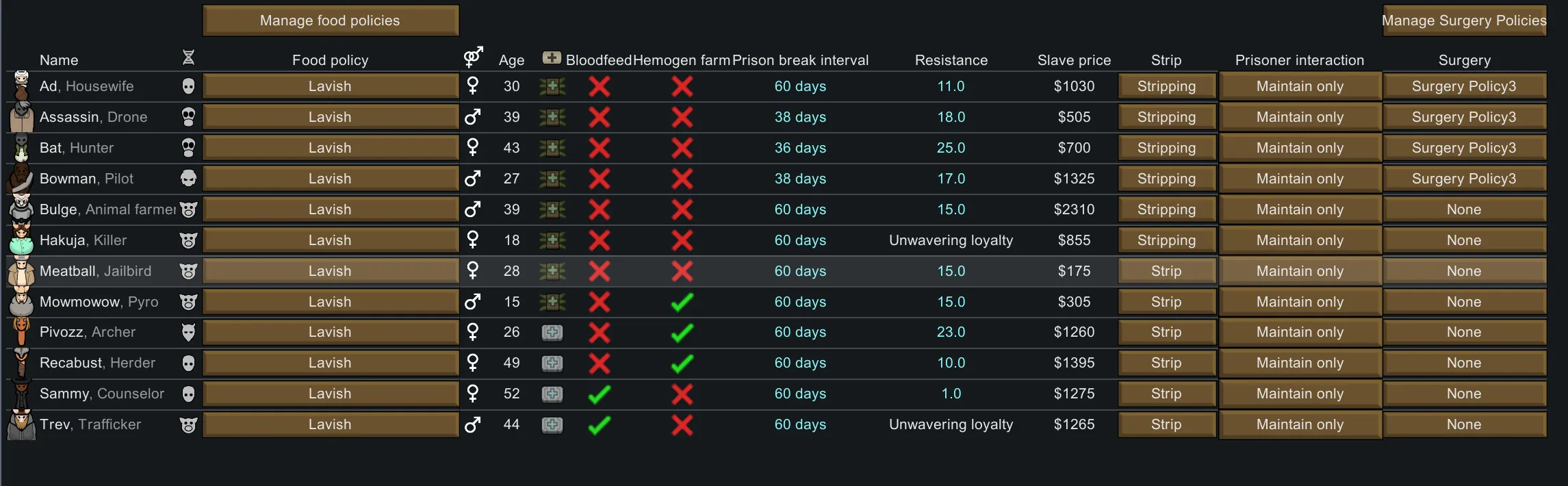 Food policies, Blood extraction (Biotech DLC), Hemogen pack extraction (Biotech DLC), Prisoner interactions (recruitment, reducing resistance, etc.), Surgery policies (1.6).