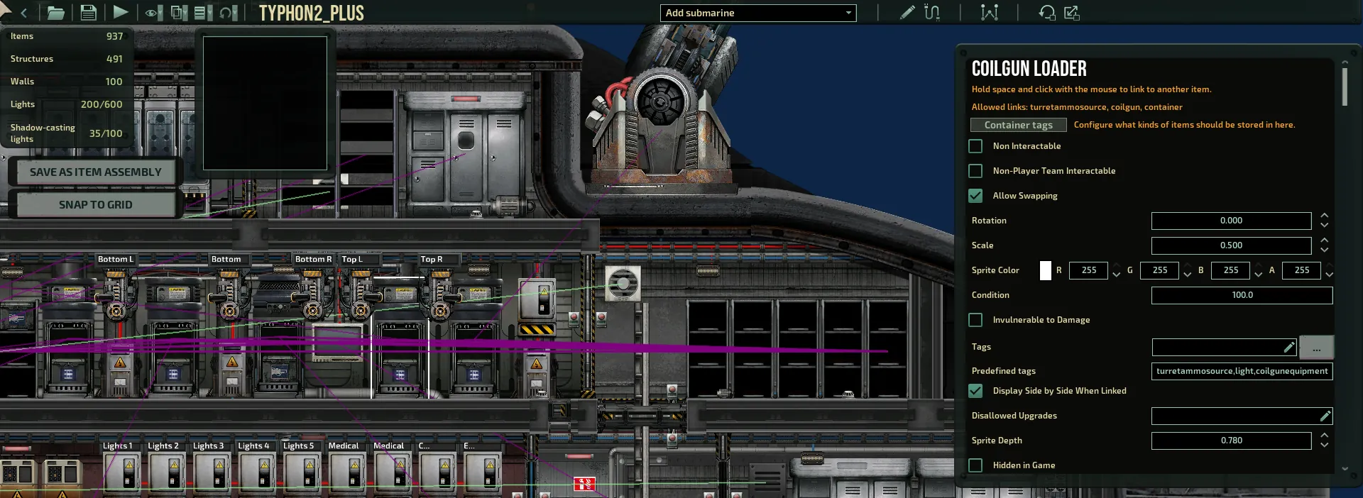 To see in-game in the submarine editor which items can be linked, you have to look at the "predefined tags"-field.