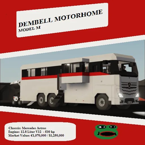 The Dembell Motorhome Model M is a luxury motorhome built on a Mercedes-Benz Actros chassis and powered by a 12.8-liter engine producing 530 horsepower. It measures 12.0 meters in length, 2.5 meters in width, and 4.0 meters in height, providing a spacious and comfortable interior. Designed for long-distance travel, it combines high performance with premium craftsmanship. The motorhome is road-legal despite its size and offers top-tier living standards. Its market value is approximately €1,070,000, or about $1,250,000.