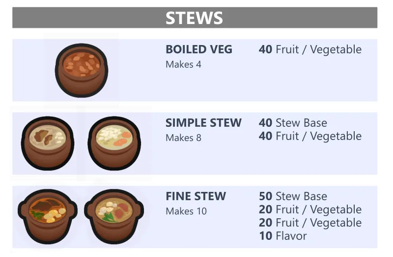 There are 3 types of stew varying in complexity as well as output. More advanced stews are more desirable as long as you have access to enough variety of ingredients to make them.