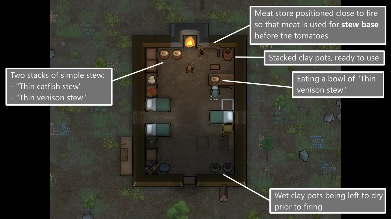 [*] Stew quality comes from variety of ingredients. Boiling a giant pot of nothing but potatoes does not a fine stew make. Stews come in 3 levels of complexity with increasing numbers and restrictions on ingredients, and some custom WorkGiver logic helps to encourage variety.